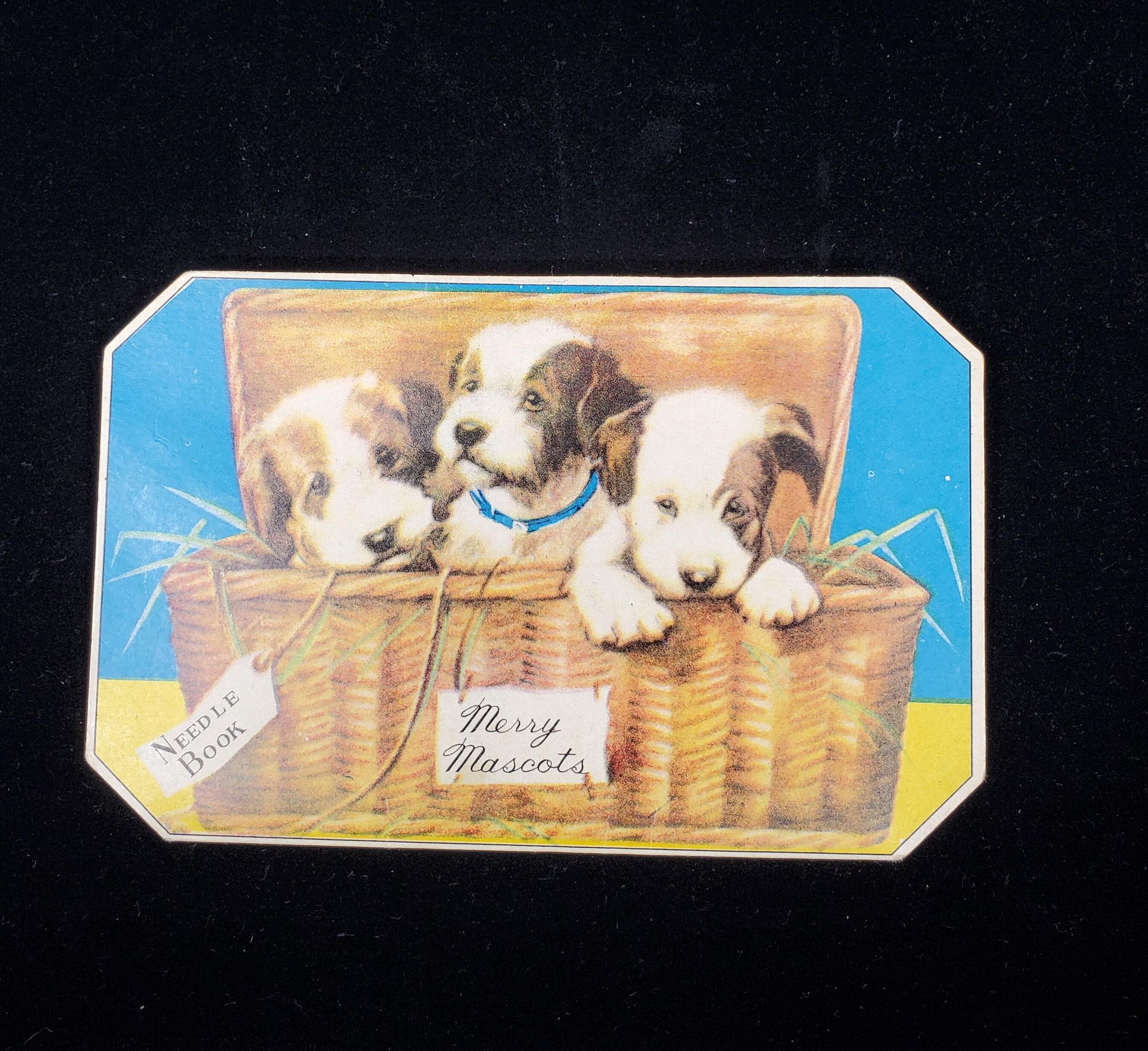 Light weight carrdboard needle book. Colours blue, brown, white,yellow. Front cover shows basket with 3 puppies . Tags read Needle Book and Merry Mascots. Also 41 needles Made in Japan. Back similar. Inside 4 foil backed areas with needles, 1 with needle threader.