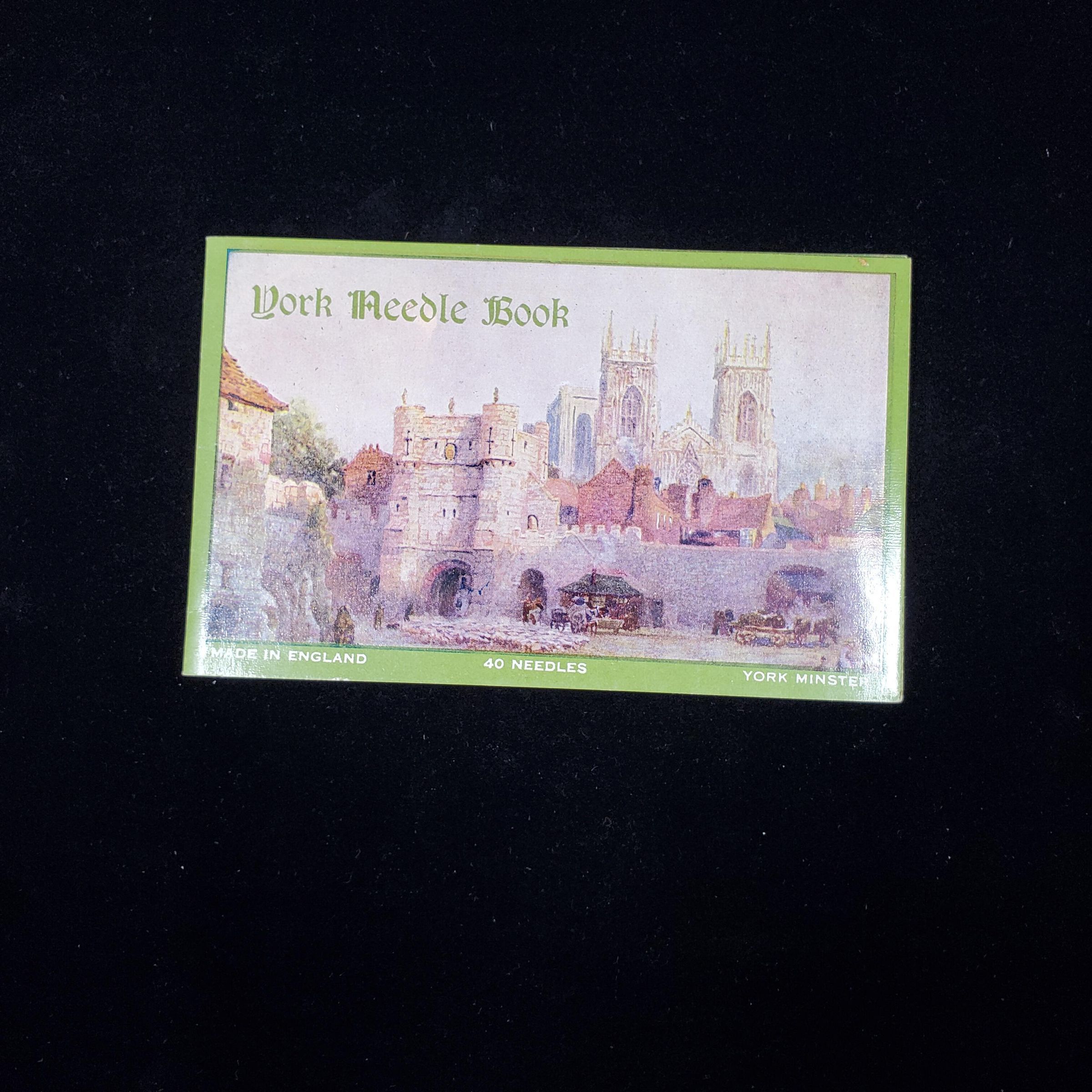 Cardboard beedle book with scene of York, Eng. on front and back Cover reads ÒTork Needle Book Made in England 40 needles York MinsteerÓ Inside 3 foil backed areas with needles.