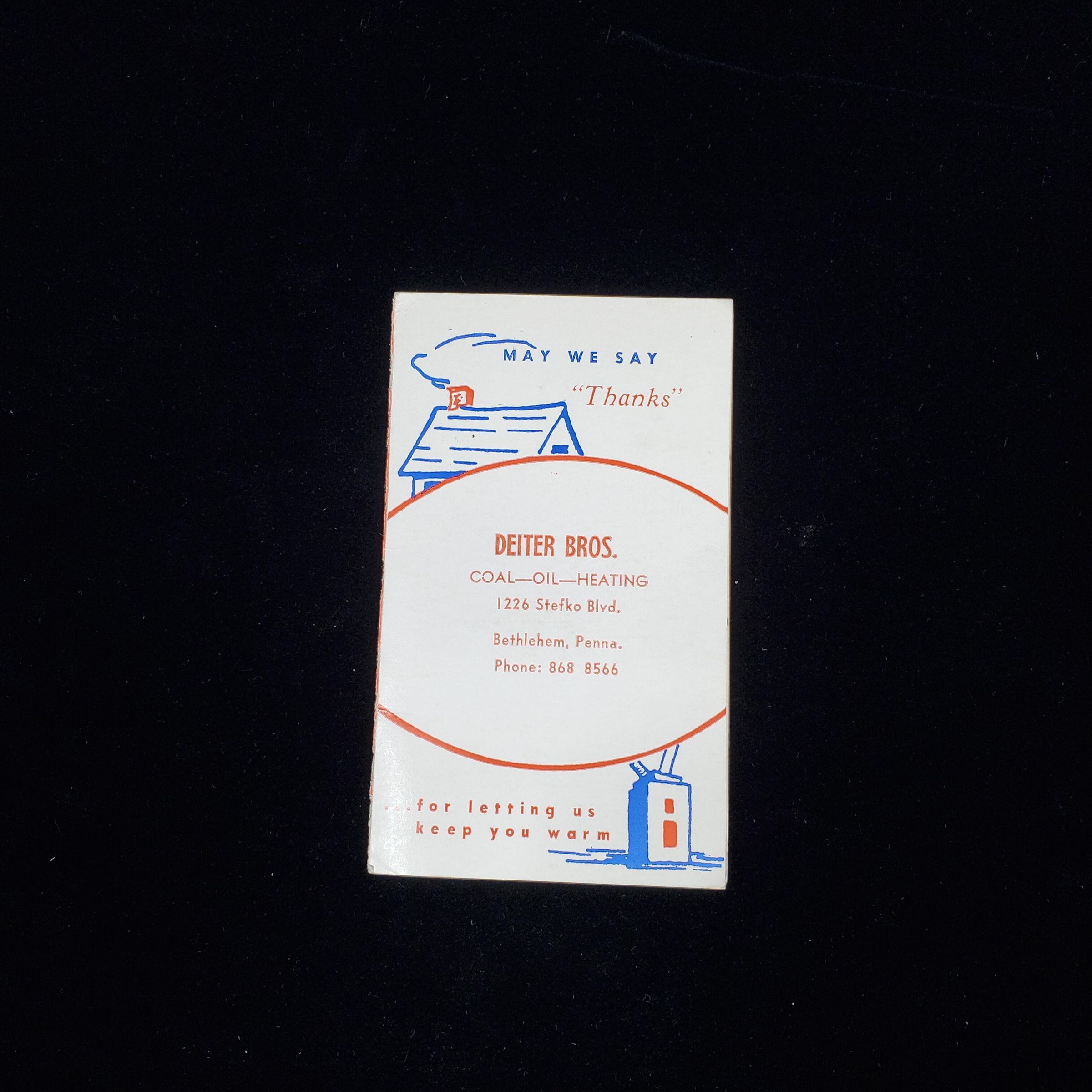 Cardboard needle book, Advertising give-away type. Colours - whiter, red, blue. CVover shows house with smoking chimney and reads ÒMay we say thanks Dieter Bros. Coal-Oil-HeatingÓ plus adress. Back more advertising. Inside needles and needle threader.