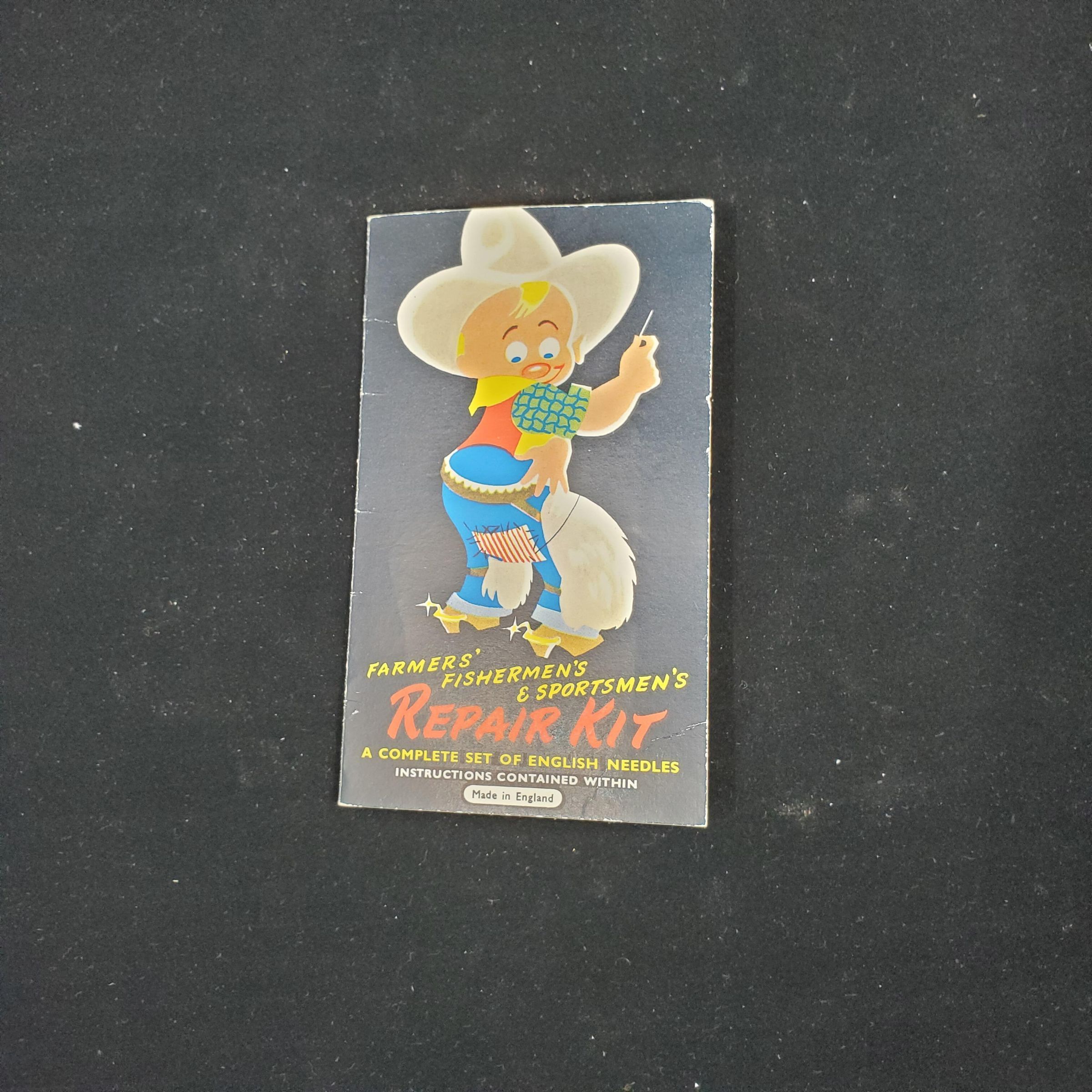 Cardboard kit . Colours - black, white, blue, red, green, yellow. Picture on front of colourful cowboy sewing with words ÒFarmersÕ FishermenÕs & SportmenÕs Repair Kit A Complete Set of English Needles Instructions Contained Within Made In EnglandÓ Inside needles plus instructions and uses.