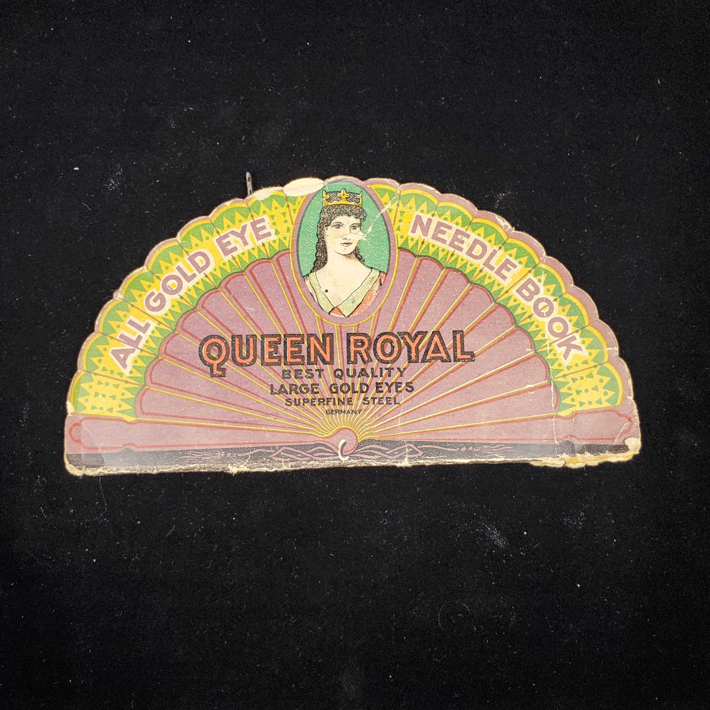 Cardboard needle book. Colours - brown,yellow, green, red. . Outside cover shows bust of woman with crown and reads ÒAll Gold Eye Needle Book Queen Royal Best Quality Large Gold Eyes Superfine Steel GermanyÓ Back same, Inside 4 packets Queen Royal Needles, 1 open area with needles and one missing.