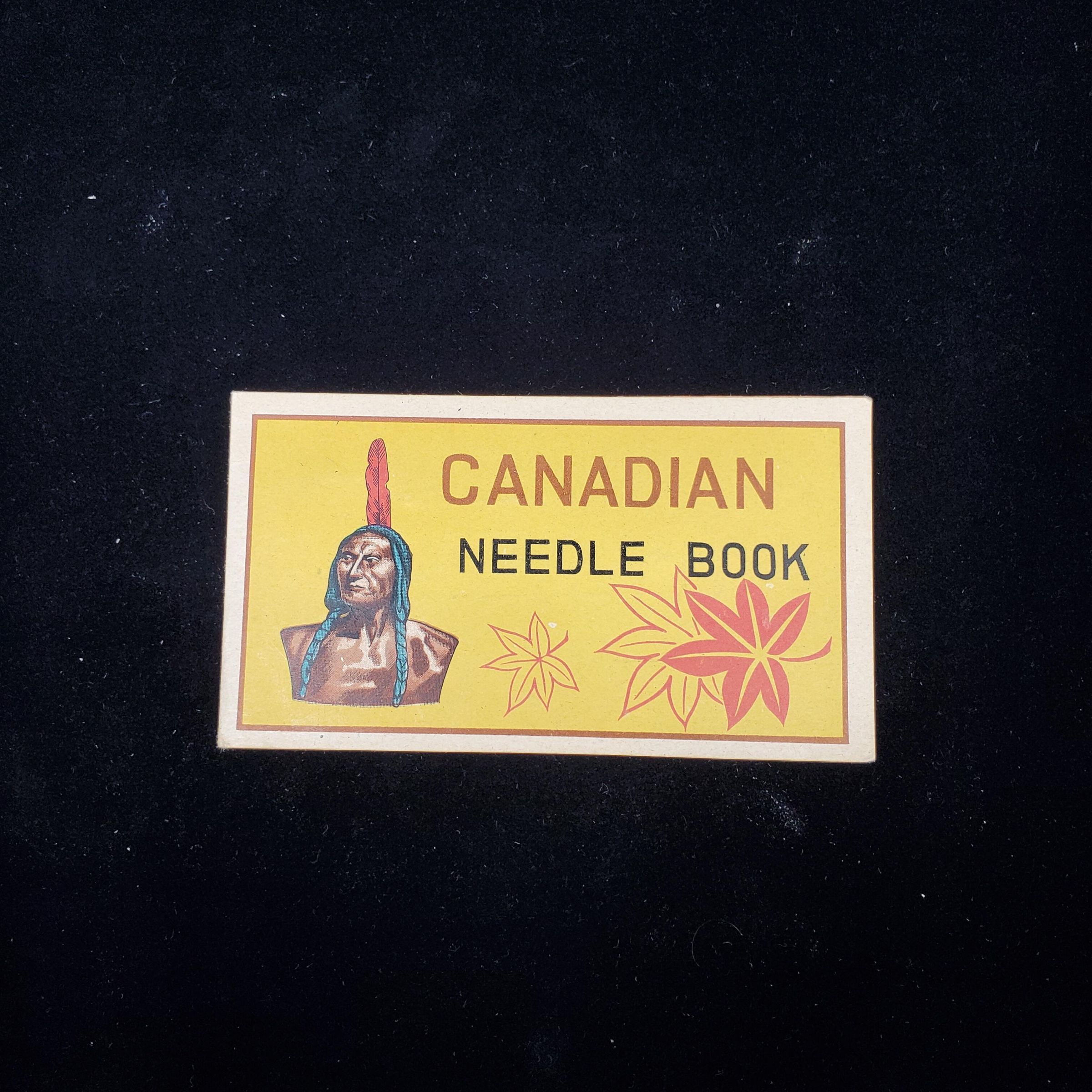 Small cardboard needle book. Colours - yellow, green, red, black. Cover shows native Indian with red feather and maple leaves and reads ÒCanadian Needle BookÓ Back shows 2 totem poles, reads same as front plus 19 needles. Inside 3 packets Superior silver-steel needles plus one open area of needles.