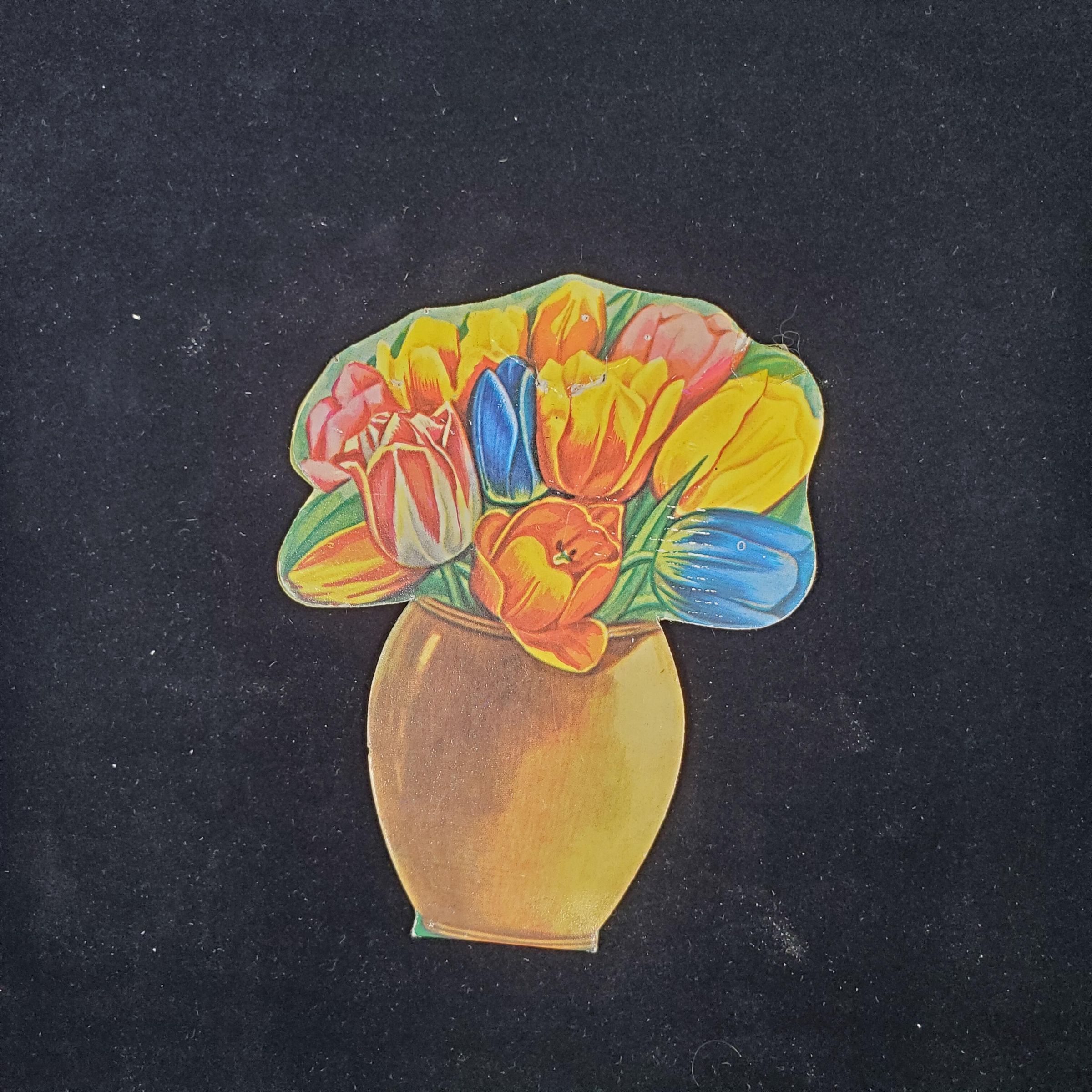 Cardboard needle book in shape of vase of tulips. Colours - yellow, brown, blue, green, red.. Cover is vase of tulips. Both sides same except one reads ÒForeignÓ. Inside 3 foil backed areas - 2 with needles, 1 with needle threader.