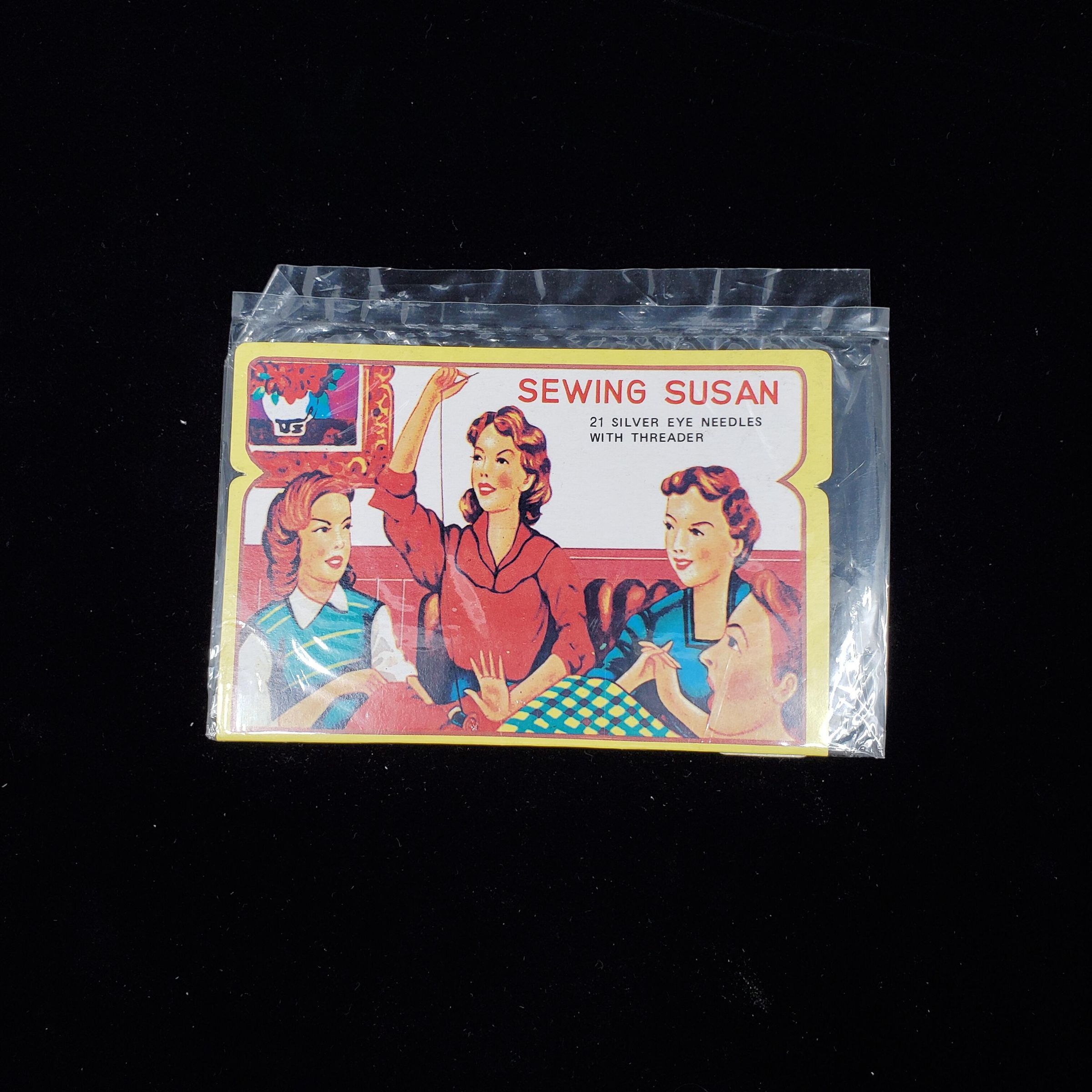 Cardboard needle book. Colours - red, white, blue, green. Cover shows 3 women sewing and reads ÒSewing Susan 21 silver eye needles with threaderÓBack same. Inside 2 foil backed areas with needles, 1 with needle threader.
