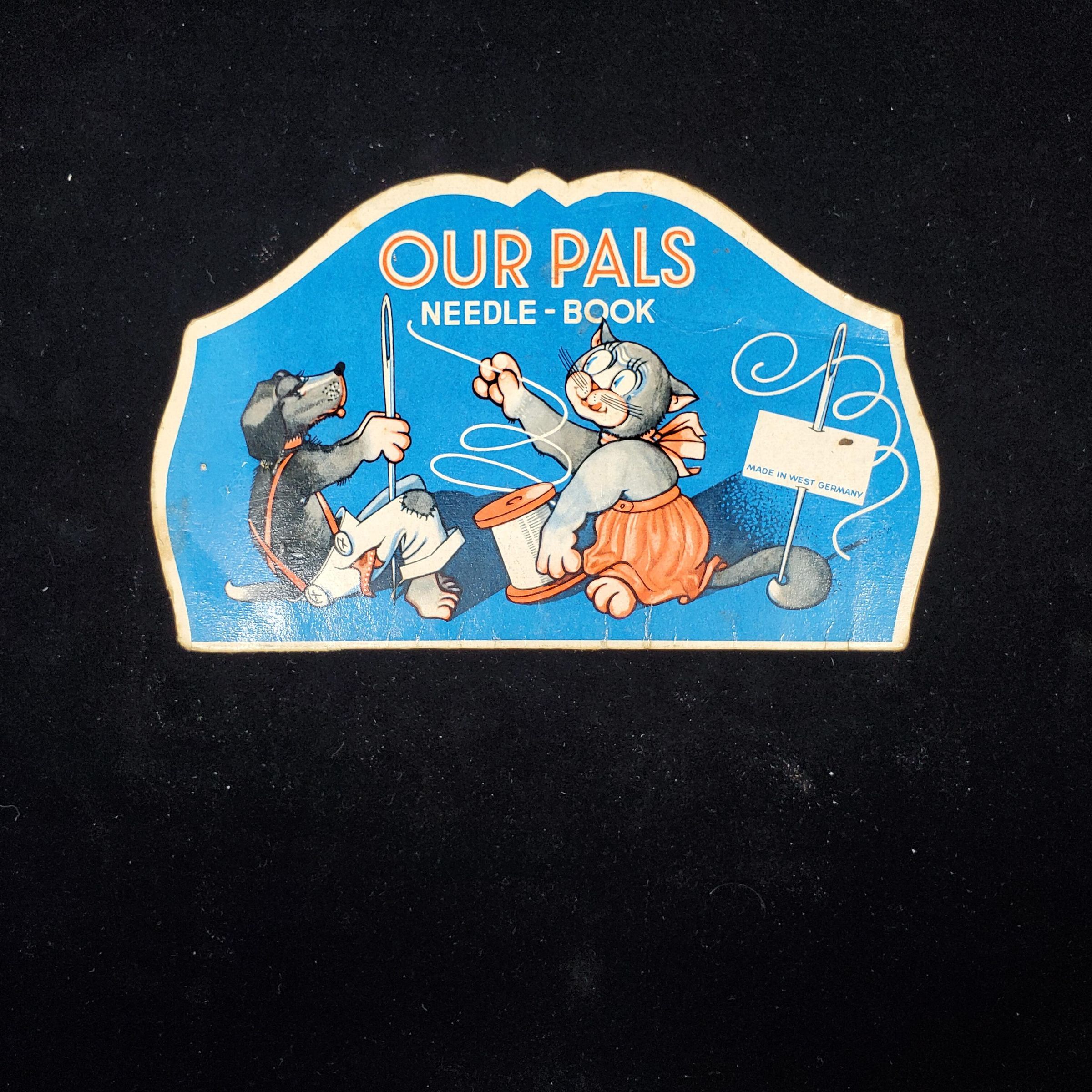 Cardboard needle book. Colours - blue, red, white,gray black. Cover shows cat and dog with needle & thread . Reads ÒOur Pals Needle Book Made in West GermanyÓ Back same.Inside 6 foil backed areas for needles.