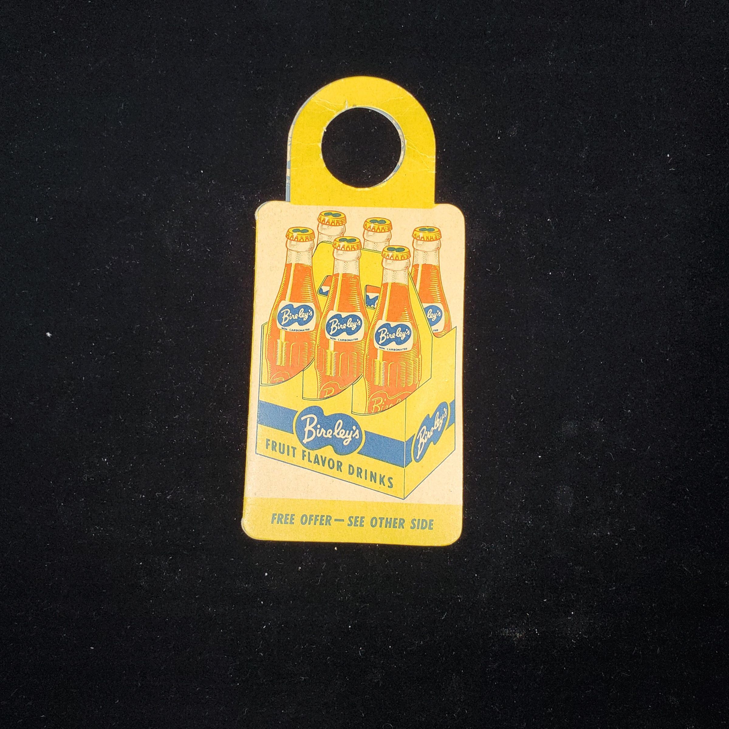 Cardboard Advertising needle book in shape of bottle carrier with hole near top for carrying. Colours - yellow, red, blue. Cover shows carrier with 6 bottles of red drink reading ÒBireleyÕs Fruit Flavor DrinksÓ andÓFree Offer- Other SideÕ Back - more advertising.Inside 6 foil backed areas of needles and1with threader.