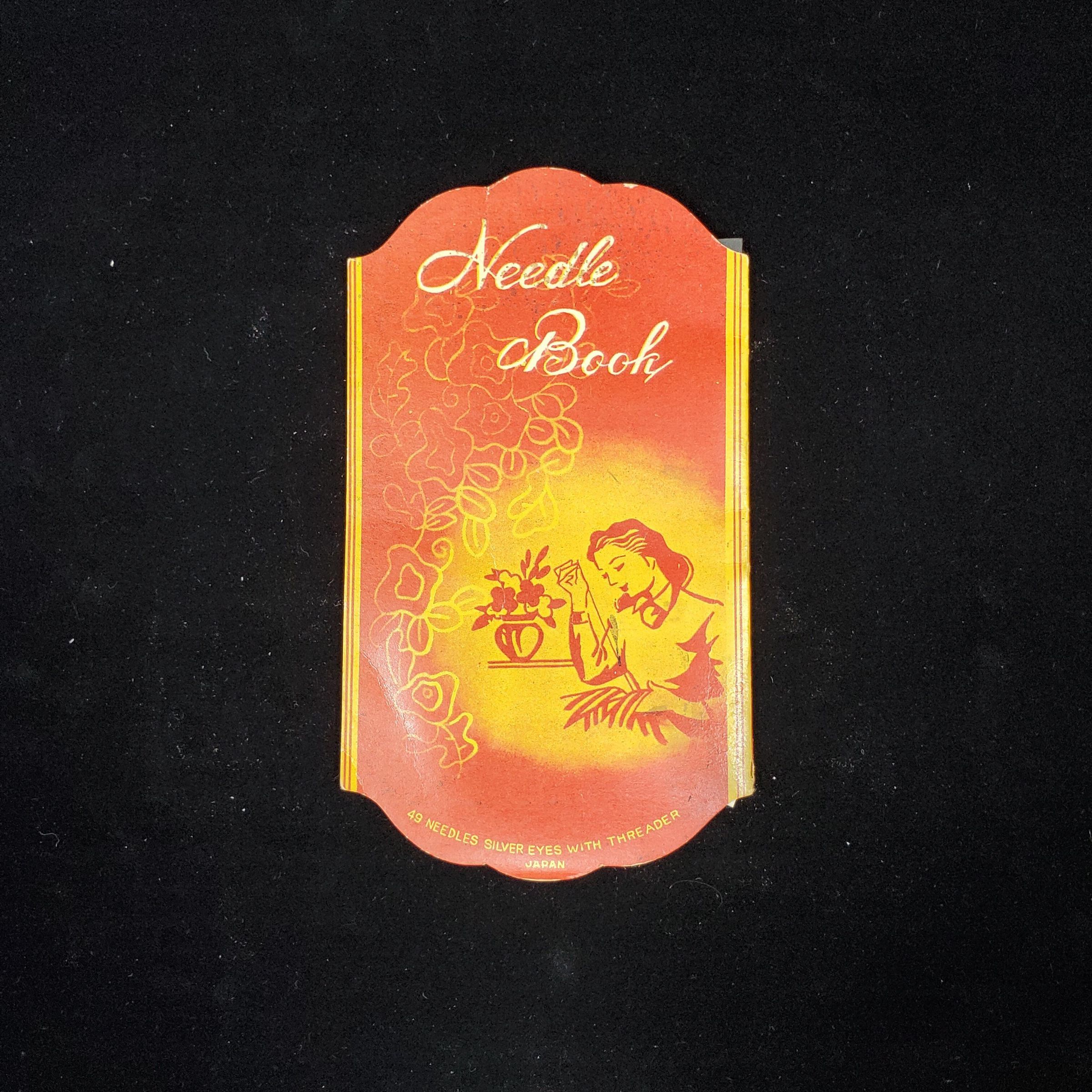 Cardboard needle book. Colours - yellow , red. Cover shaped, and shows picture of woman sewing and reads ÒNeedle Book - 49 Needles Silver Eyes With Threader JapanÓ Back cover same. Inside 5 areas for foil backed needles, one missing. ! foil backed area for needle threader.
