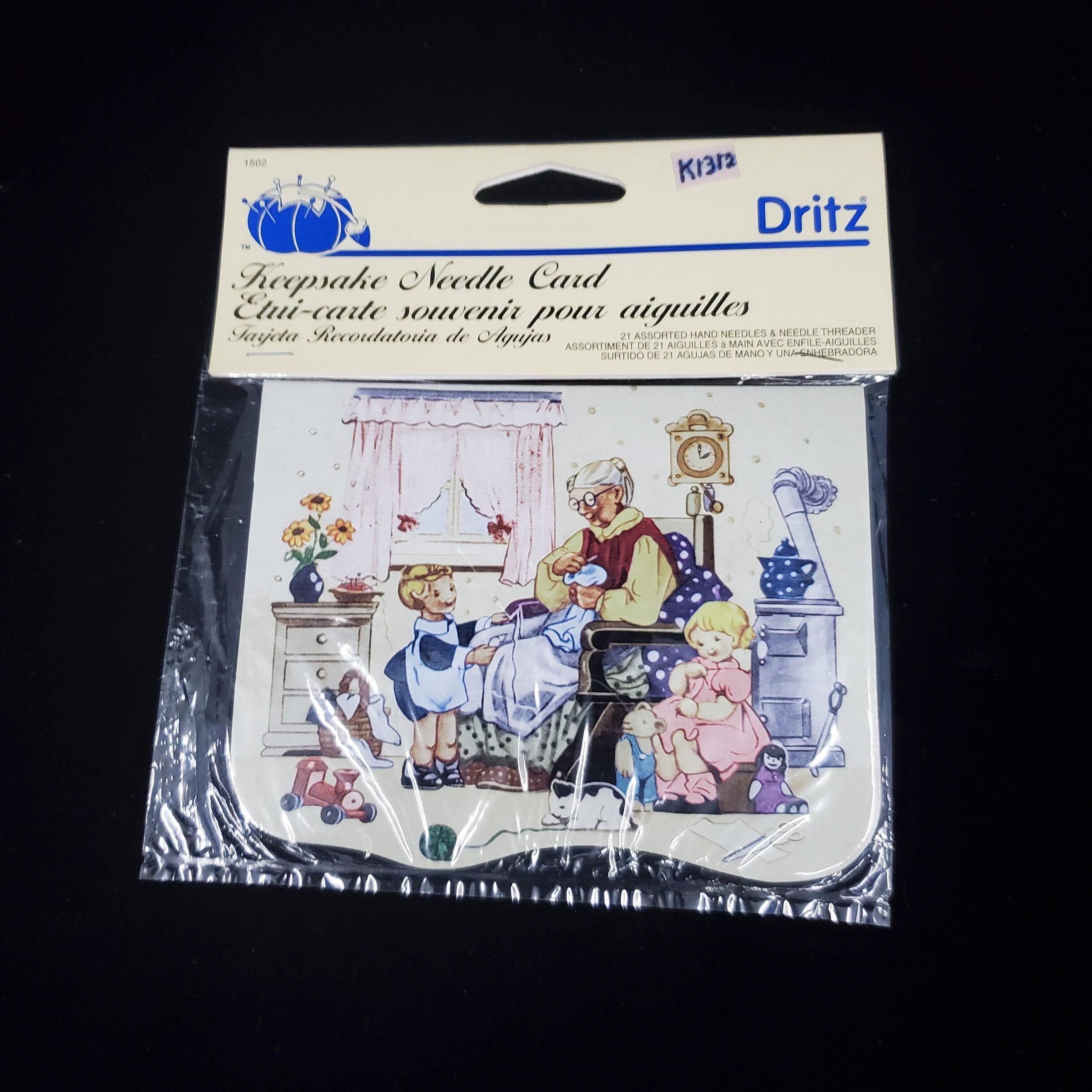 Reproduction Needle Card from the original Prym Needle Card Collection. In cellophane package with advertising in both French ,Spanish &English. Cover shows older woman with 2 young children - cat, scissors, ball of wool, needles, stove, toys, etc.Dritz advertising.Contains 21 assorted needles & threader