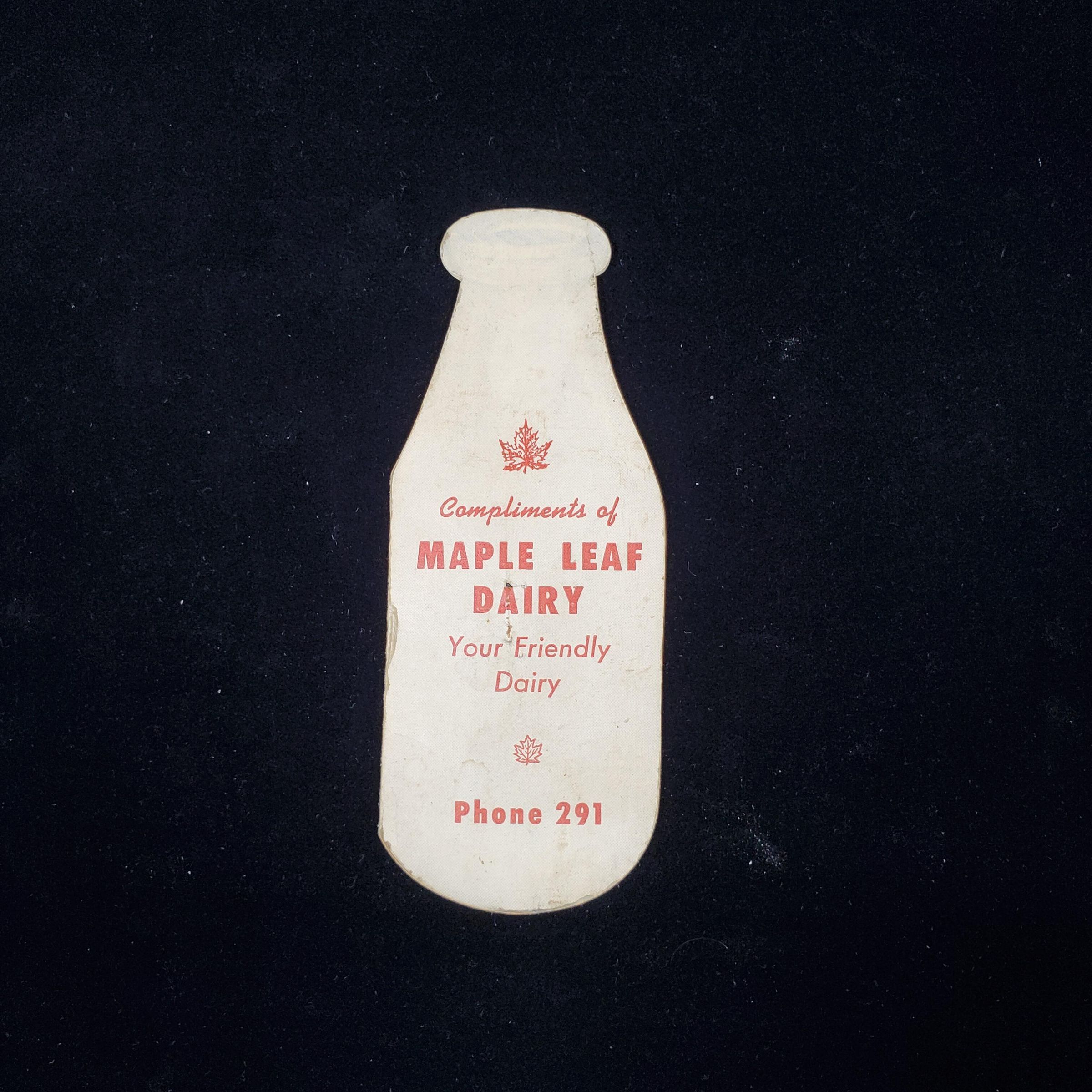 Cardboard needle packet in shape of milk bottle. White with red print. Front reads 'Complments of Maple Leaf Dairy Your Friendly Dairy Phone 291Ó Back has message of thanks. Inside 1 foil backed area with needles, and 1 packet of needles. It reads ÒA Stitch in Time Saves Nine' and 'Dairy products Advertising Weston Ont.'