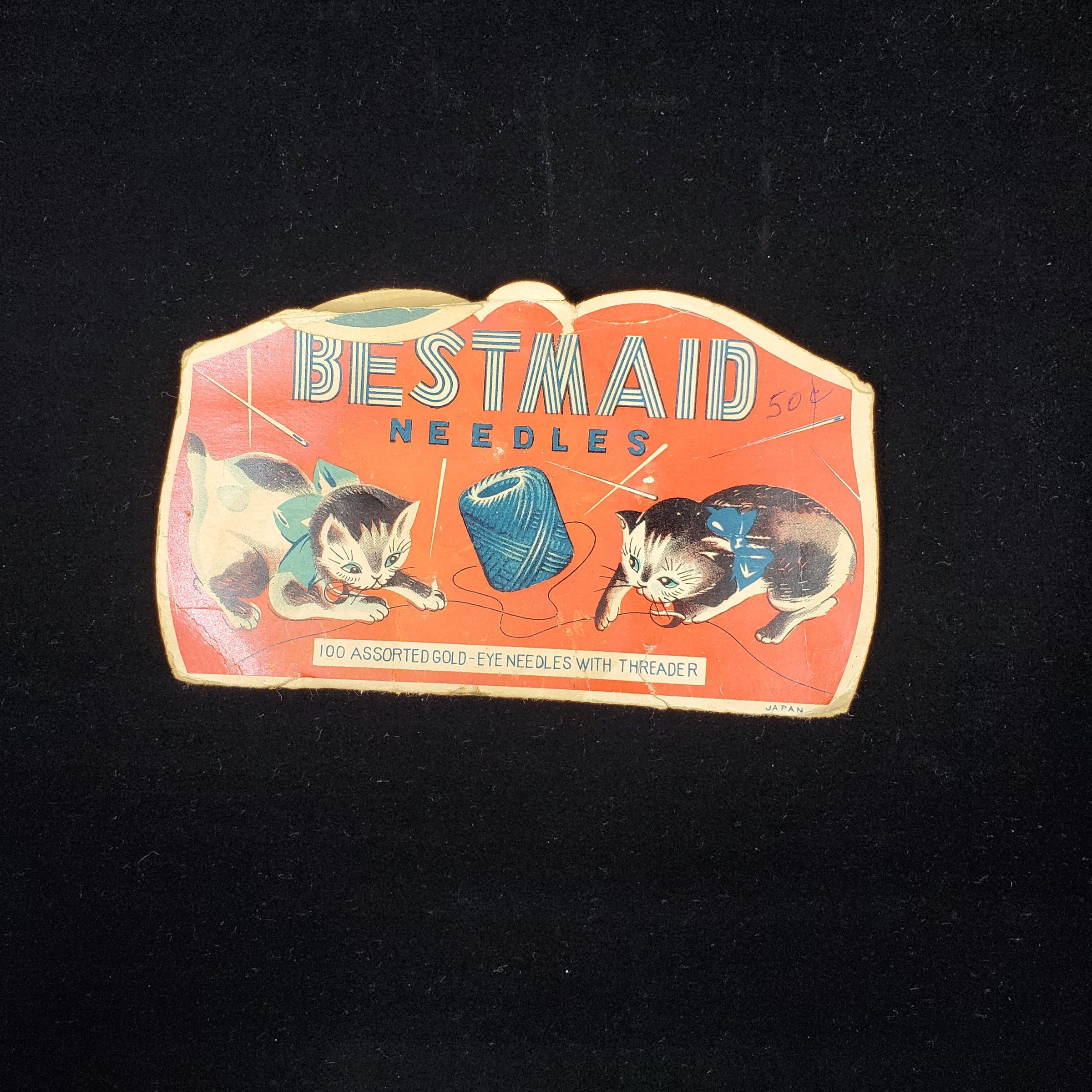 Red, blue coloured cardboard needle book. 2 cats on cover laying with a ball of yarn.ÓBest Maid Needles 100 Assorted Gold-Eye Needles with Threader JapanÓ Few needles inside.