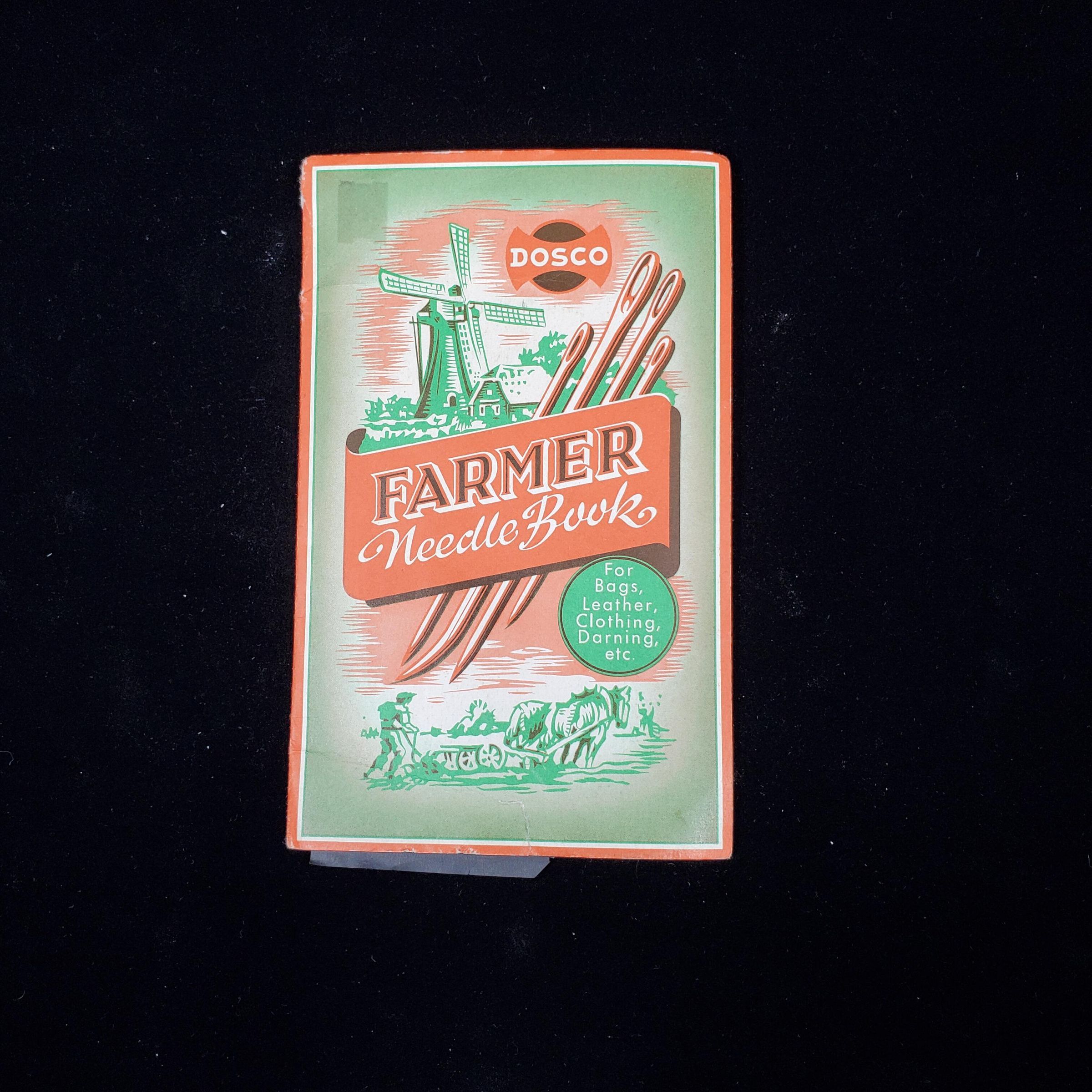 Cardboard needle book.Red, green, black & white.Front cover reads ÒDosco Farmer Needle Book For Bags, Leather,Clothing, Darning,Etc.ÓBack readsÓThe Dosco Farmer Assortment especially designed for rural residentsÓ and ÒMade in GermanyÓ Inside1gold backed, 2 red and 1 black backed areas for needles - some missing.