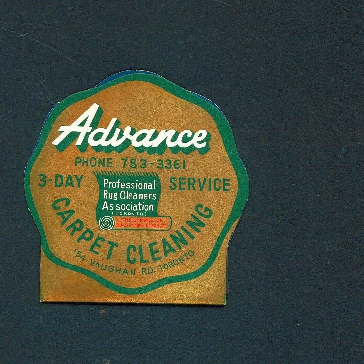 Small cardboard needle packet, never been used. Gold and green colours. Advertising Ò Advance Carpet Cleaning 154 Vaughan Rd. Toronto Phone 783-3361 on front.