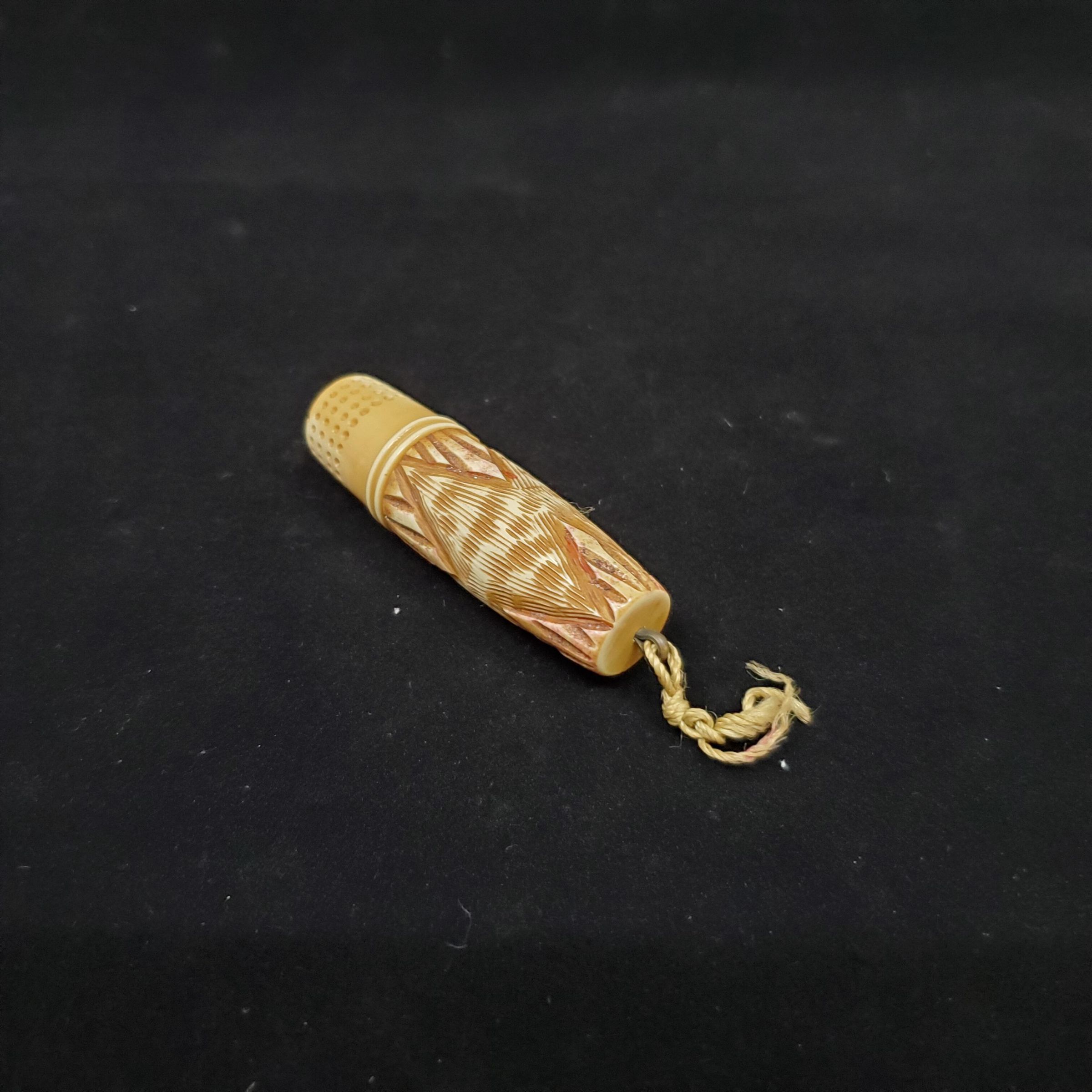 Needle Case as purchased ,empty, with thimble top, Brown and white Art Deco design on main body of case, incised lines. Faint signs of red show. Thimble is top of case.Remains of tassel at case end through brass loop. Brown and white thimble. 2 raised bands at rim. Wide plain band above then knurling to and over top. No marks.