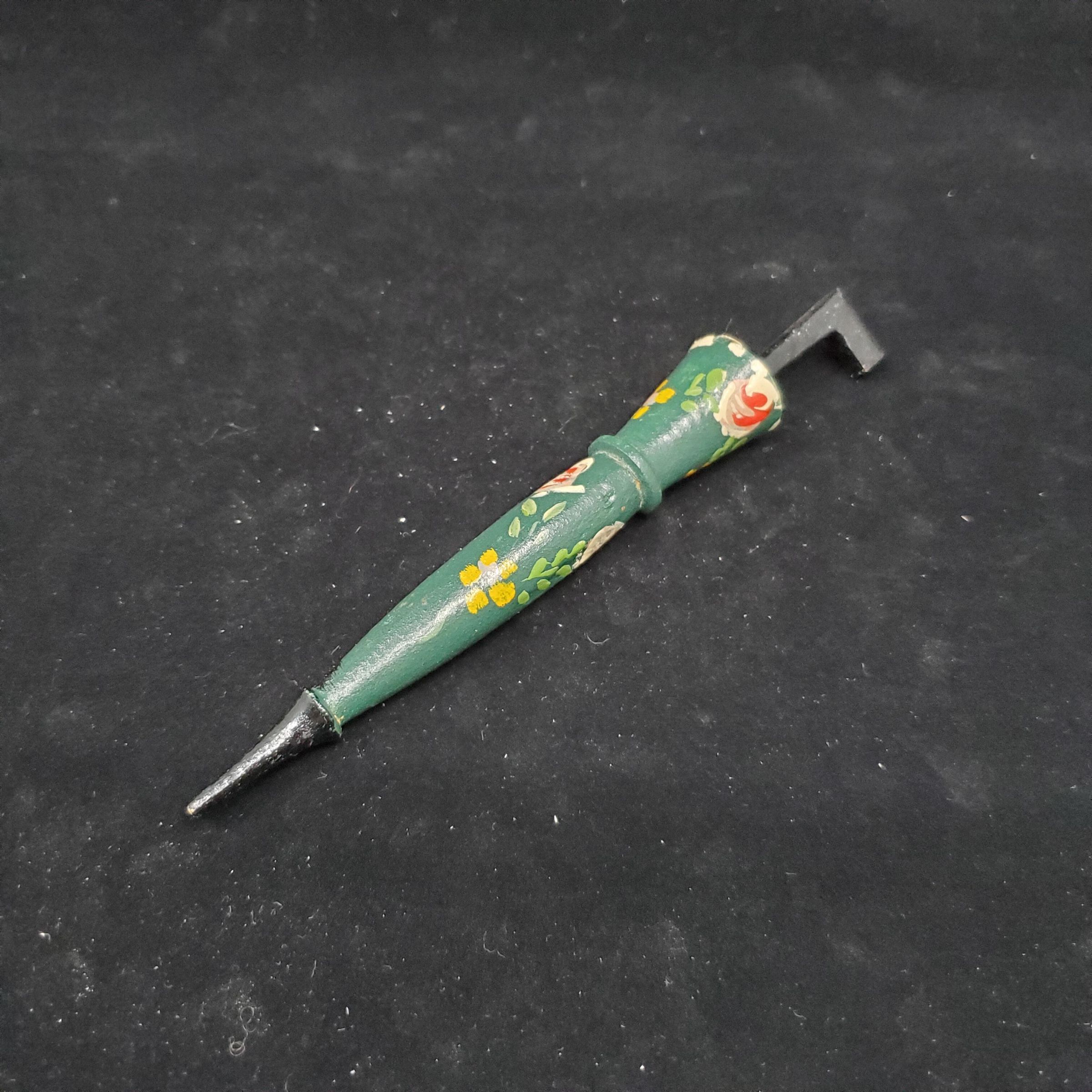 Wooden needle case, umbrella shaped. Hand painted. Main colour is dark green with black handle and tip. Roses in white and red, yellow petalled flowers and lighter green leaves on main body of case. Pull off top.