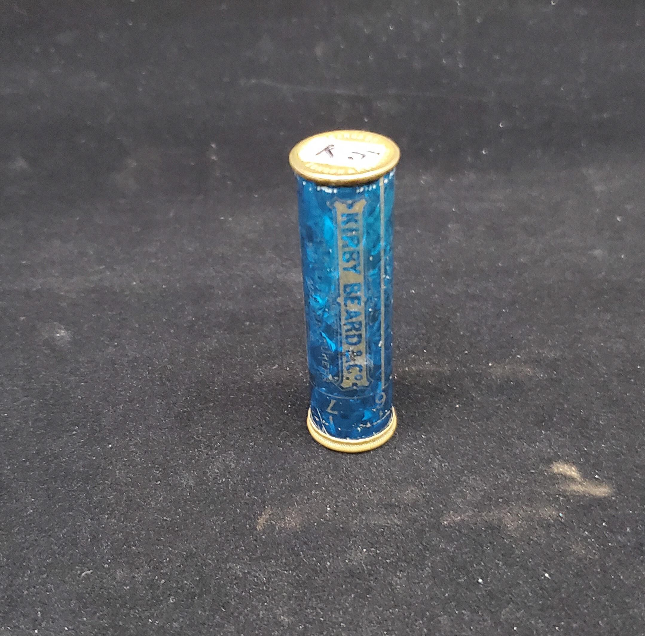 Blue tubular metal, brass, needle case. Advertising.. One end reads ÒJannckeÕs Metrailleuse Patent Needle CaseÓ Hole for needles to come out of. Blue colour between ends reads ÒKirby Beard & Co Needle Manufacturers London. Birmingham, Redditch & ParisÓ