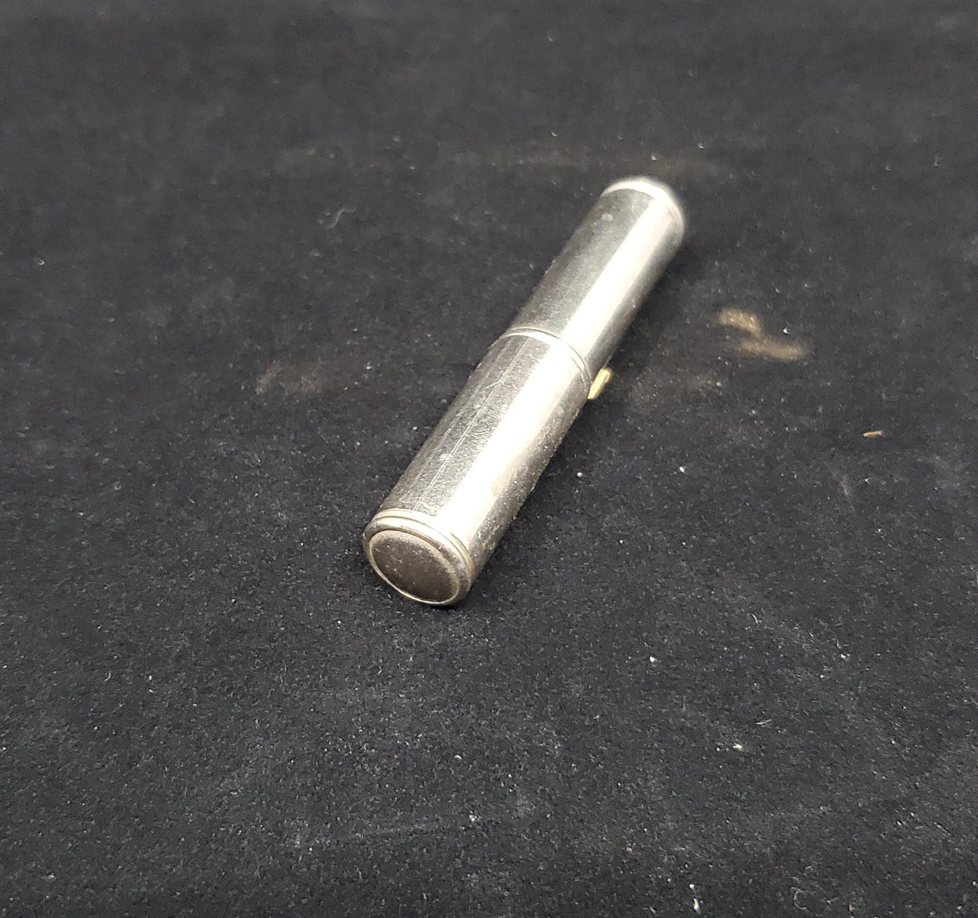 Metal, silver coloured, tubular needle case. Inside rolled cardboard with threads and needles. No marks.