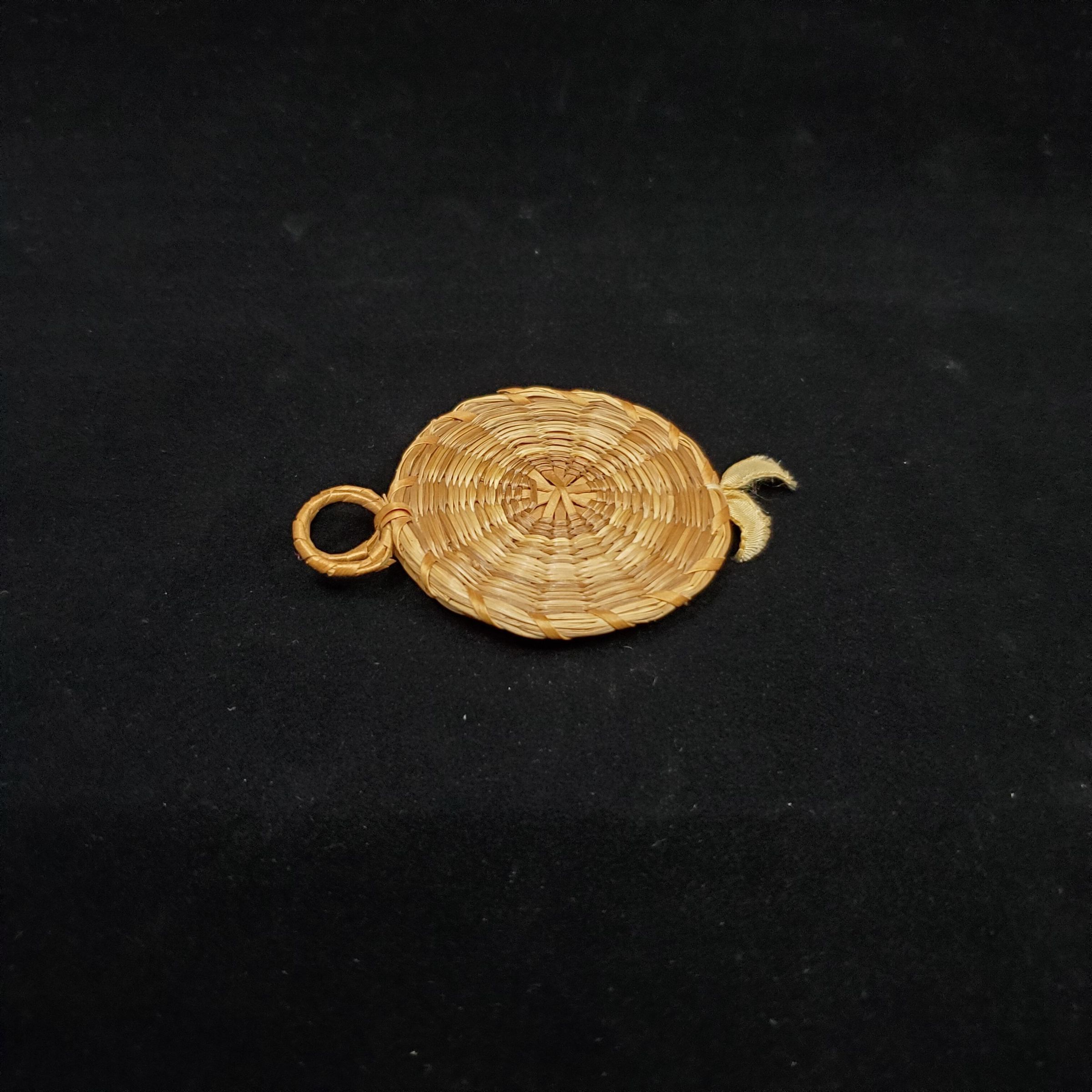 Woven grass needle or pin case, light to medium brown in colour. Round, front and back woven pieces tied at bottom with yellow ribbon. Top of both front and back has small woven ring for hanging.Inside, one blue flannel piece.