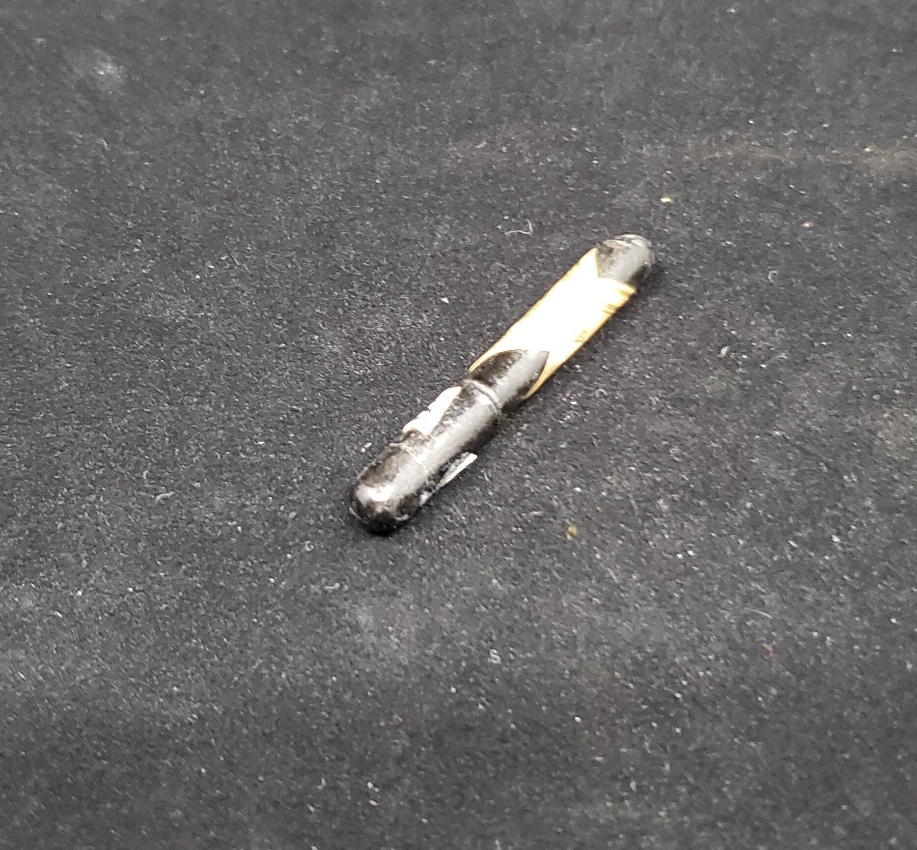 Black needle case - looks like papier mache. Cylindrical. Label with gold print reads ÒPegase Needles Sharps Registered 4/8 Made in GermanyÓ