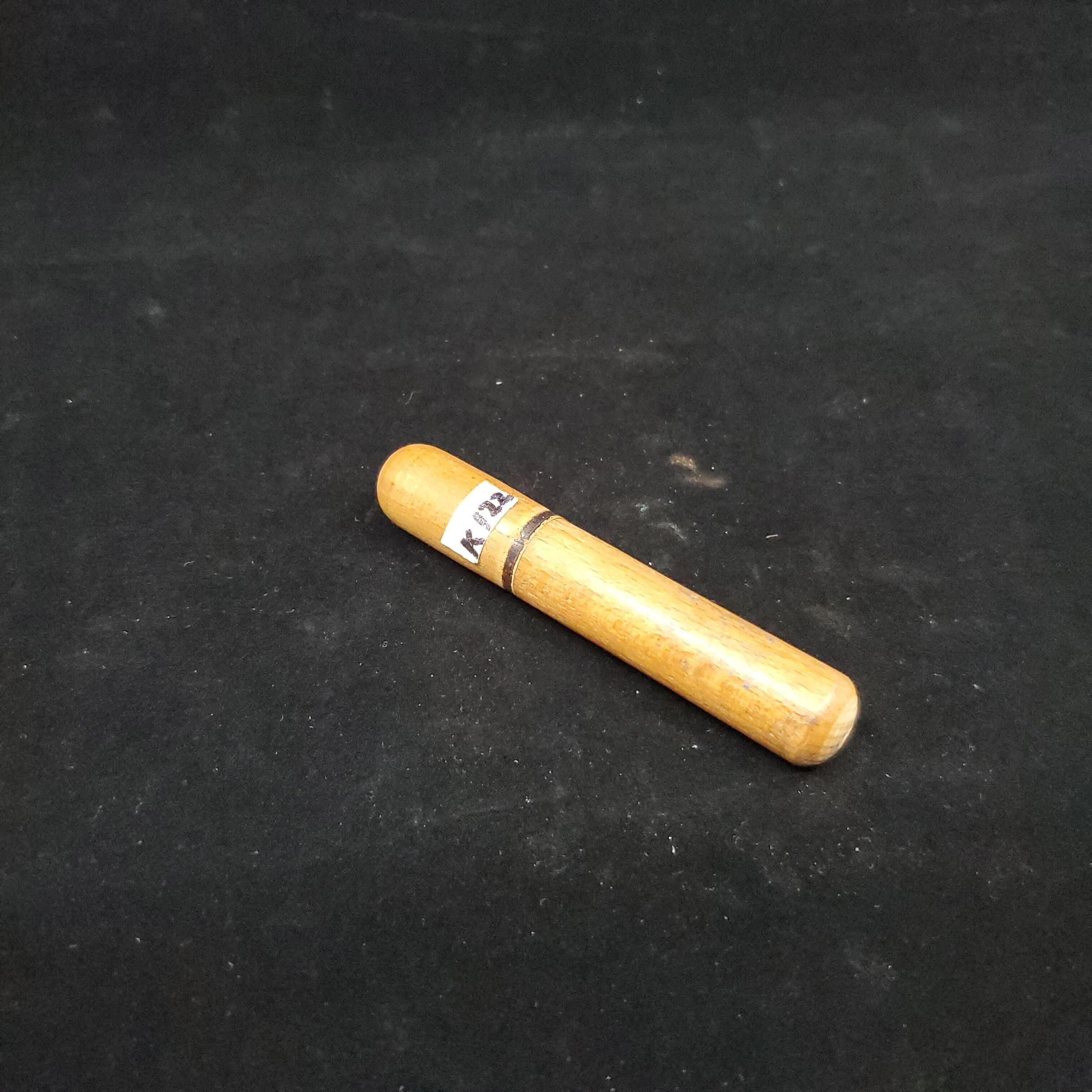Wooden needle case. Wood is a light to medium brown in colour with a dark brown to black narrow line where it opens. Push on top. Rounded ends. No marks.
