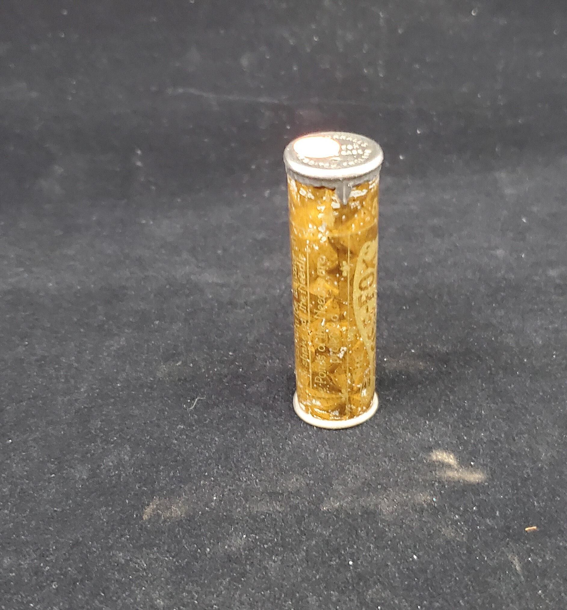 Mottled brown and gold metal needle case. Commercial type. Arrow on side at top to turn top to find right size needle, which is then shaken out of hole on top of the case.Banner with ÒCross -FoxÓ on side. Manufactured by Abel Morrall Ltd. Redditch, Eng. printed on side along with instructions for use.