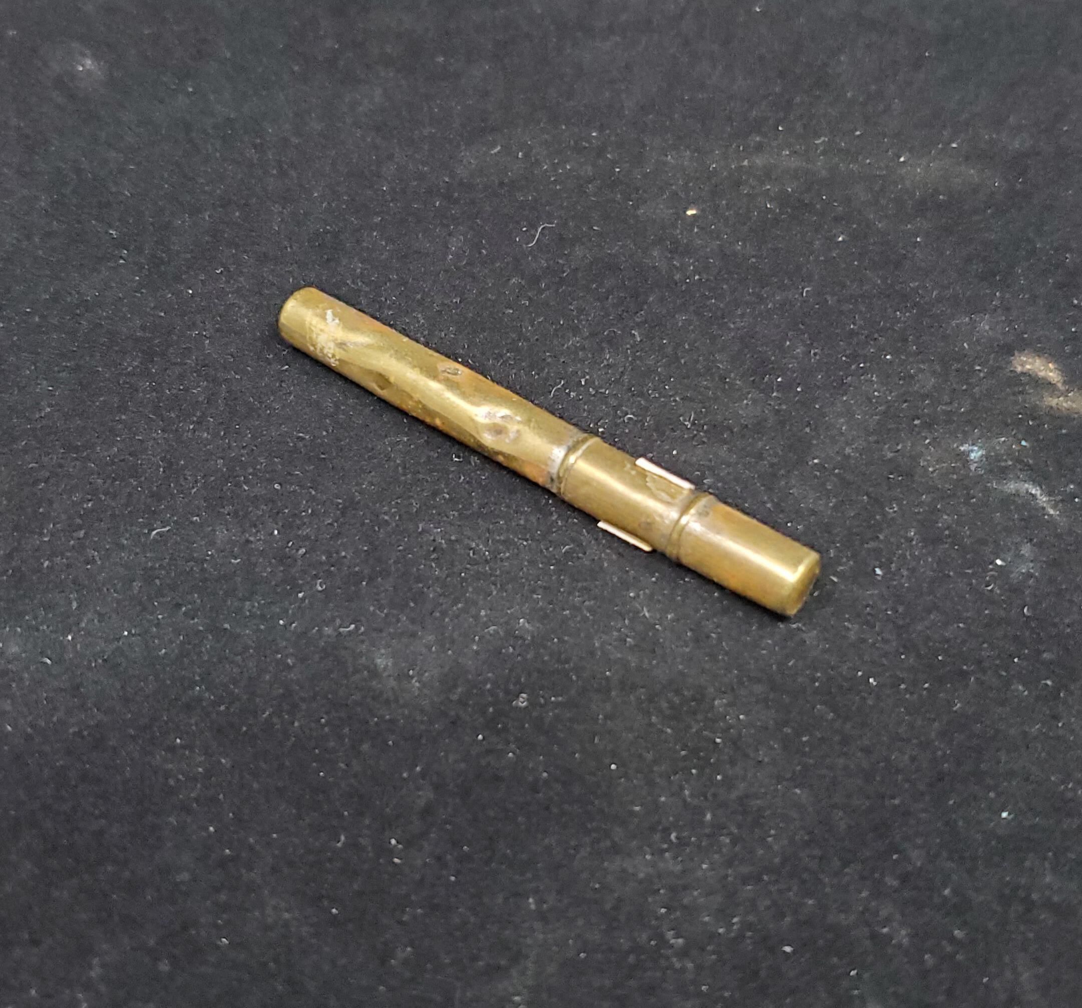 Brass needle holder, long and small diameter. Many dents. Hold inside 2 long pins, rusted.