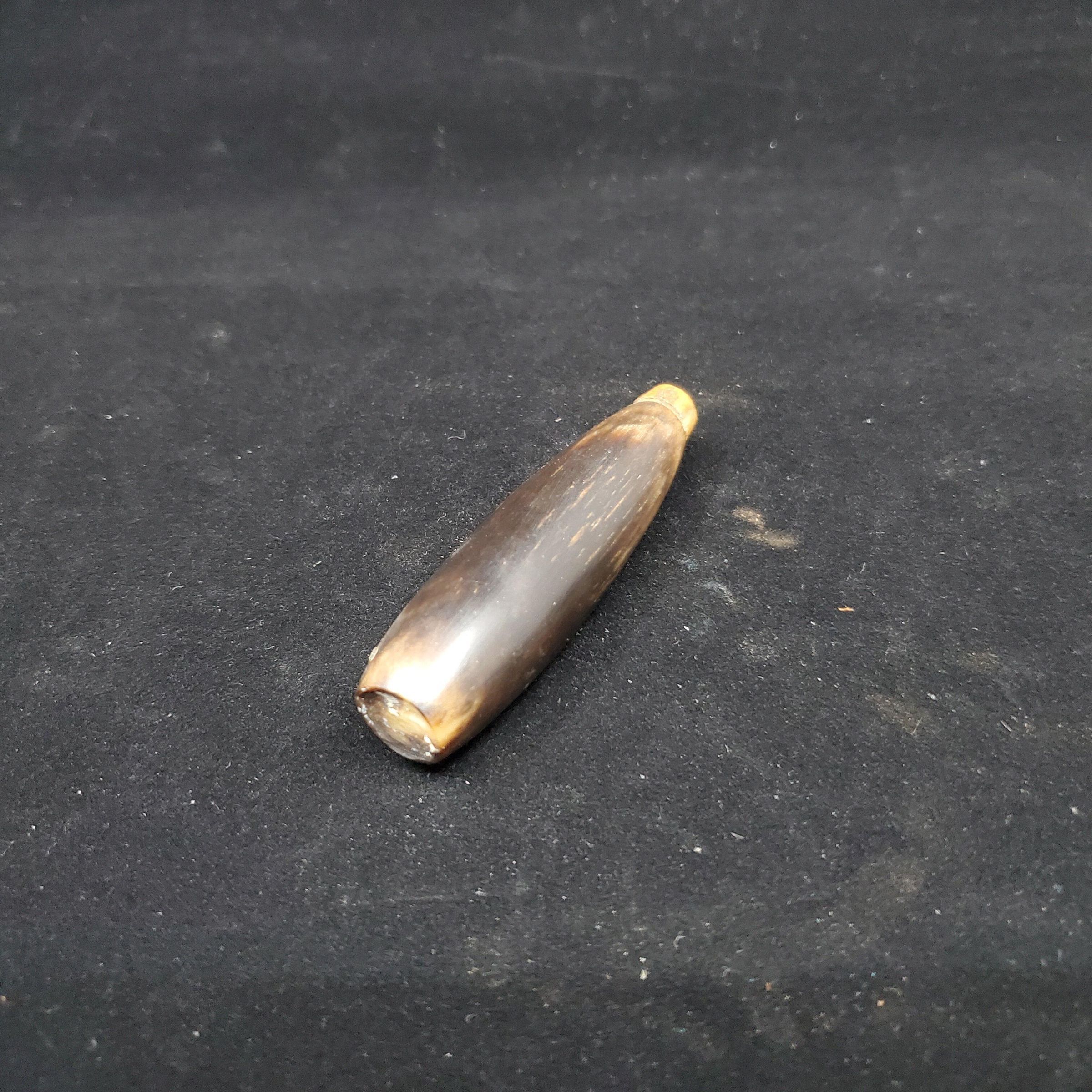 Needlecase of horn.Dark brown with some lighter markings. Light tan wooden stopper. No marks