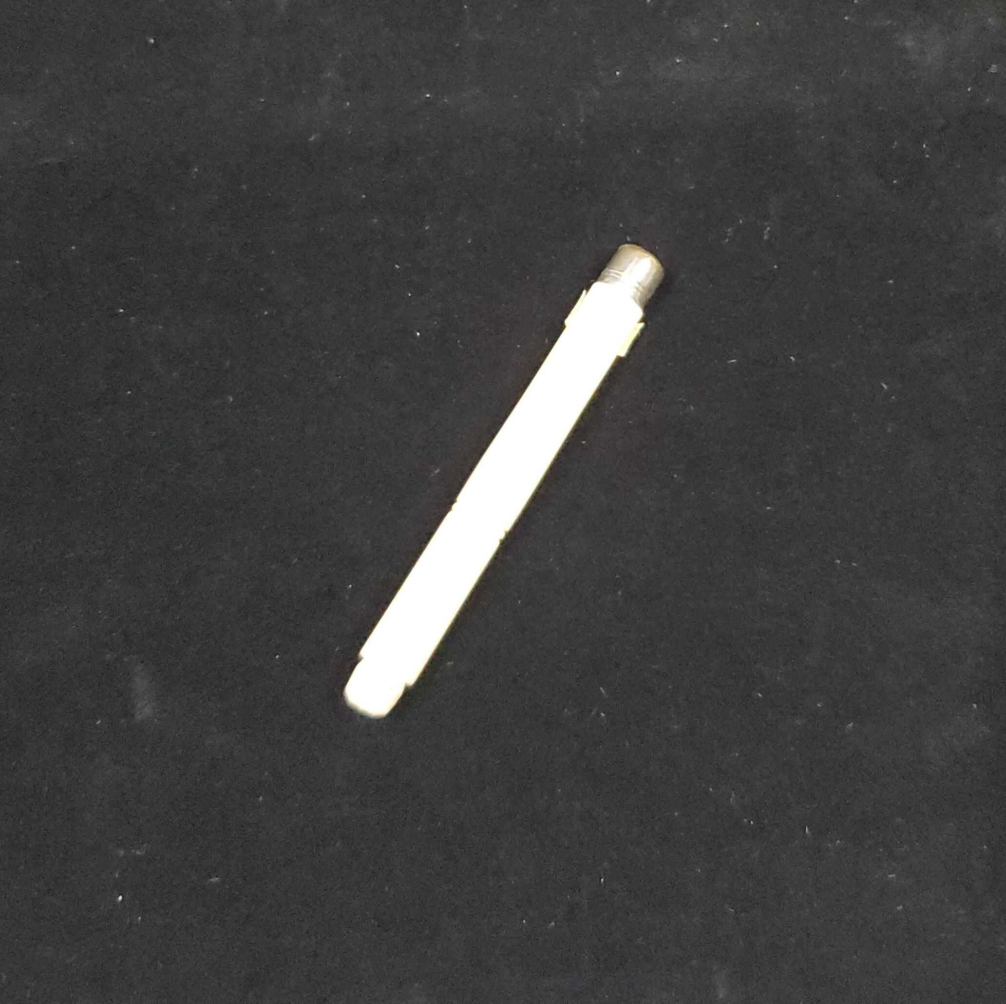 Bone needlecase. Tubular shape with Silver cap at one end. Missing from other end. Screw opening.
