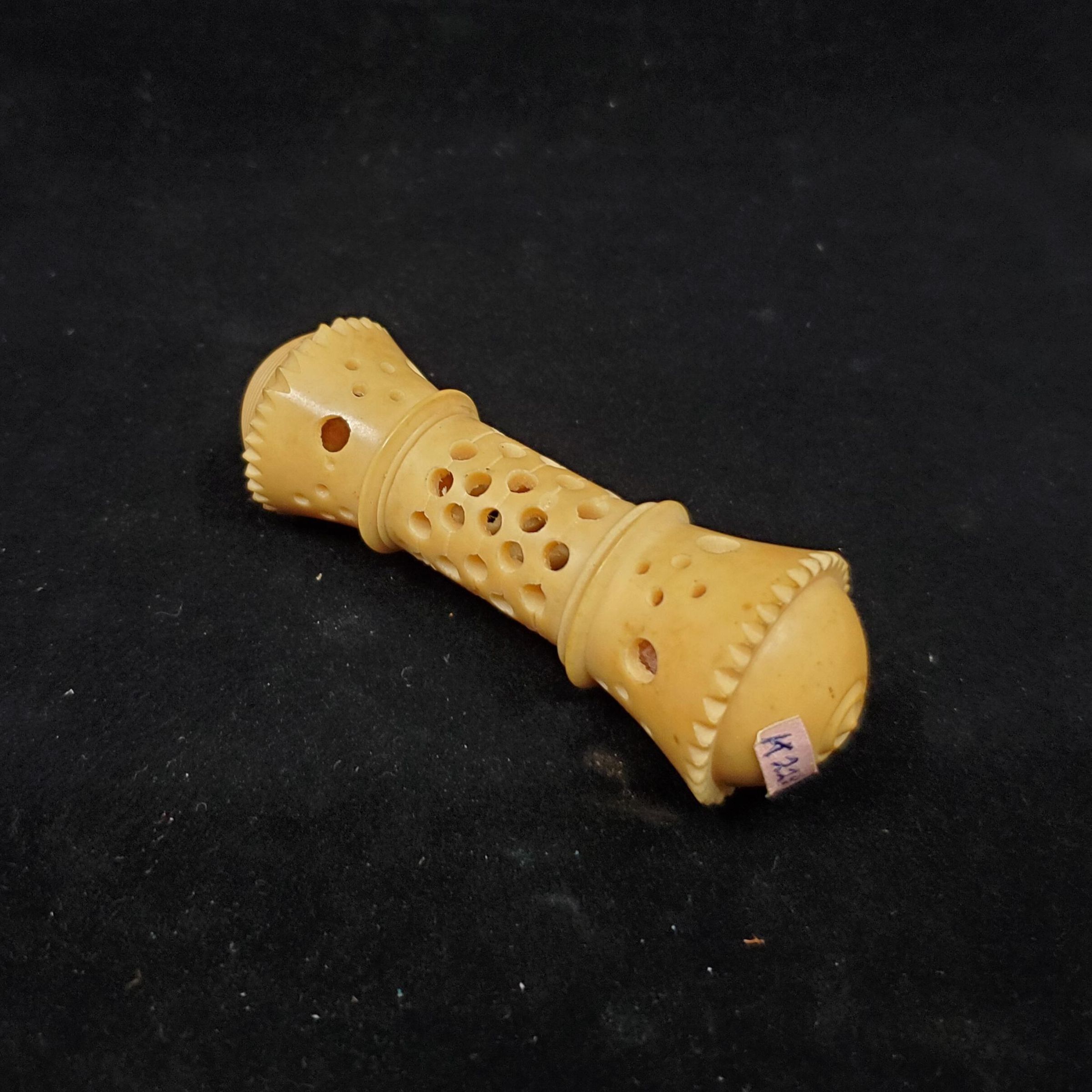 Vegetable ivory case. Loevely cram honey colour. Both ends screw off. Center area full of holes in the design Remains od a pink material in top of case - was this to clean needles with?