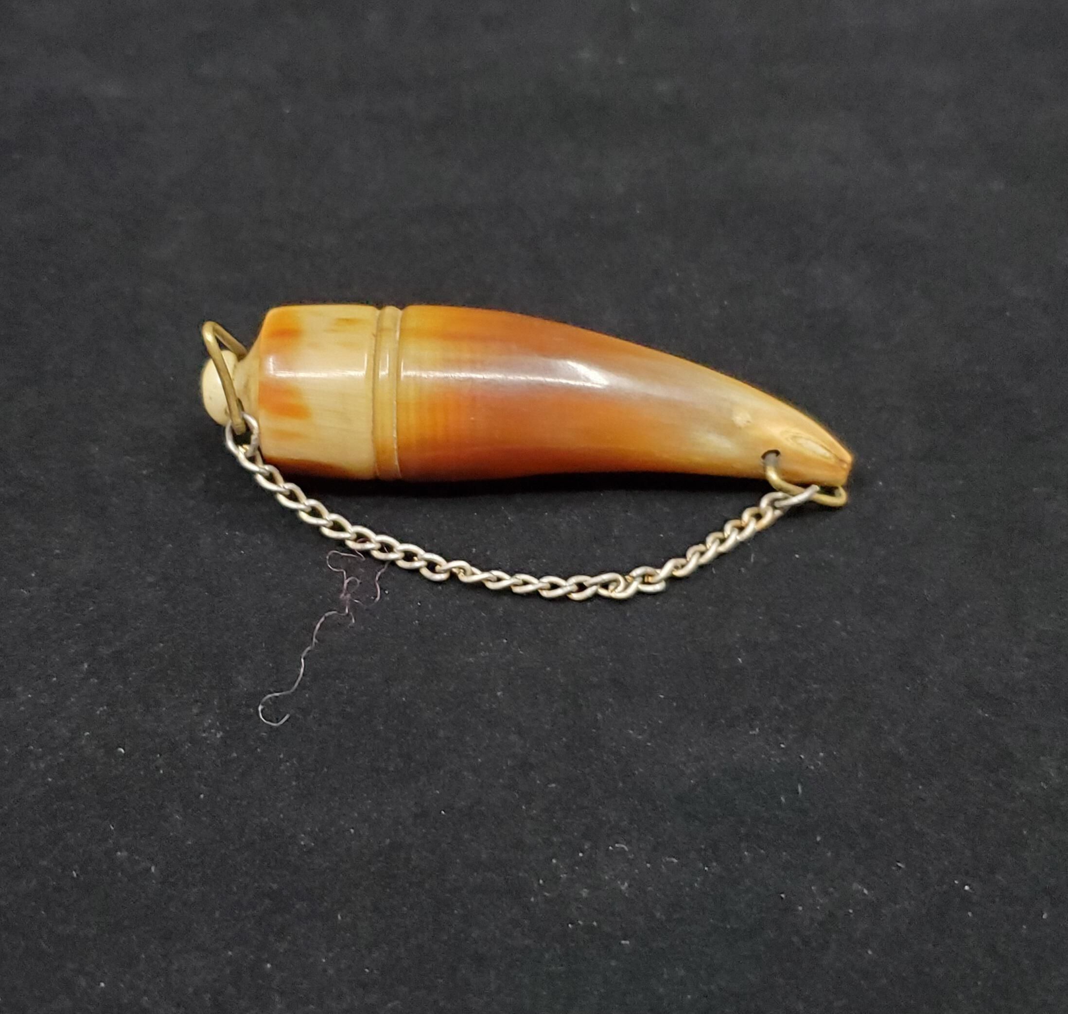 Horn needle case? Brass chain attached to top and bottom. Curved shape. Screw on top. Something inside top. Light to dark brown markings