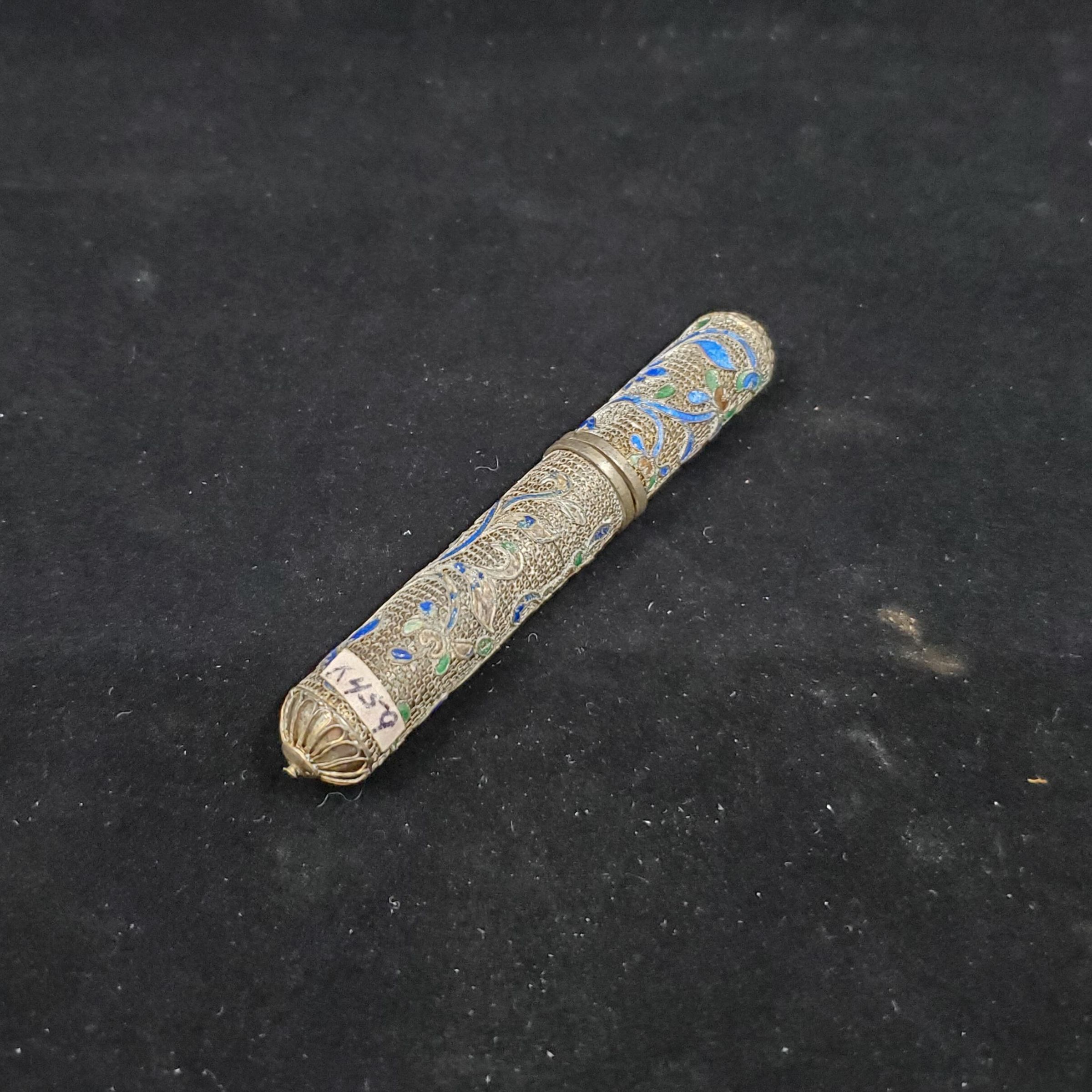 Enamelled silver filagree needle case. Fine silver wire applied on silver. Delicate flower patterns filled with blue and yeelow coloured enamels.