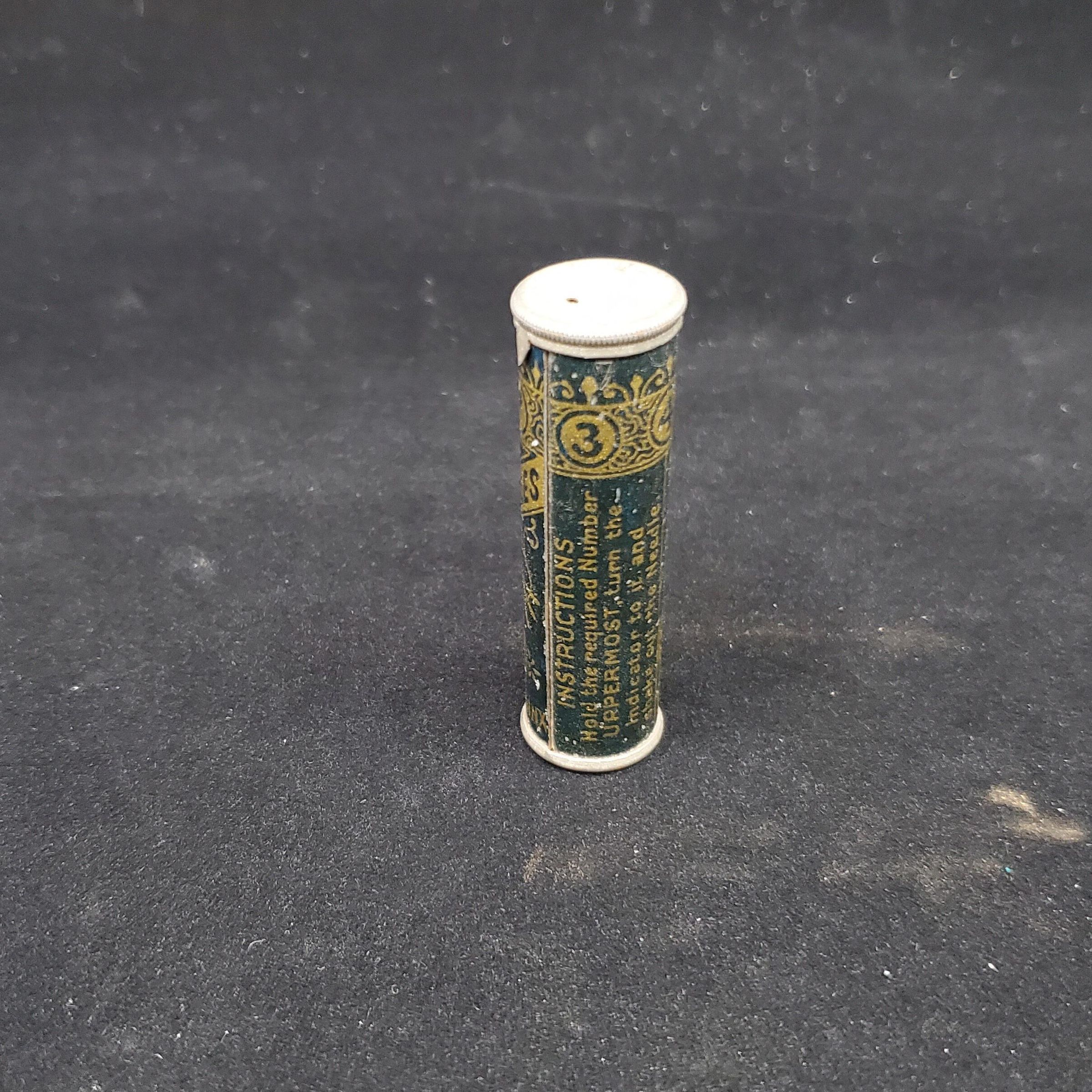 Tubular metal needle case. ÒSphinxÓ brand needles, made in Redditch, England. Instructions for obtaining needles on side.