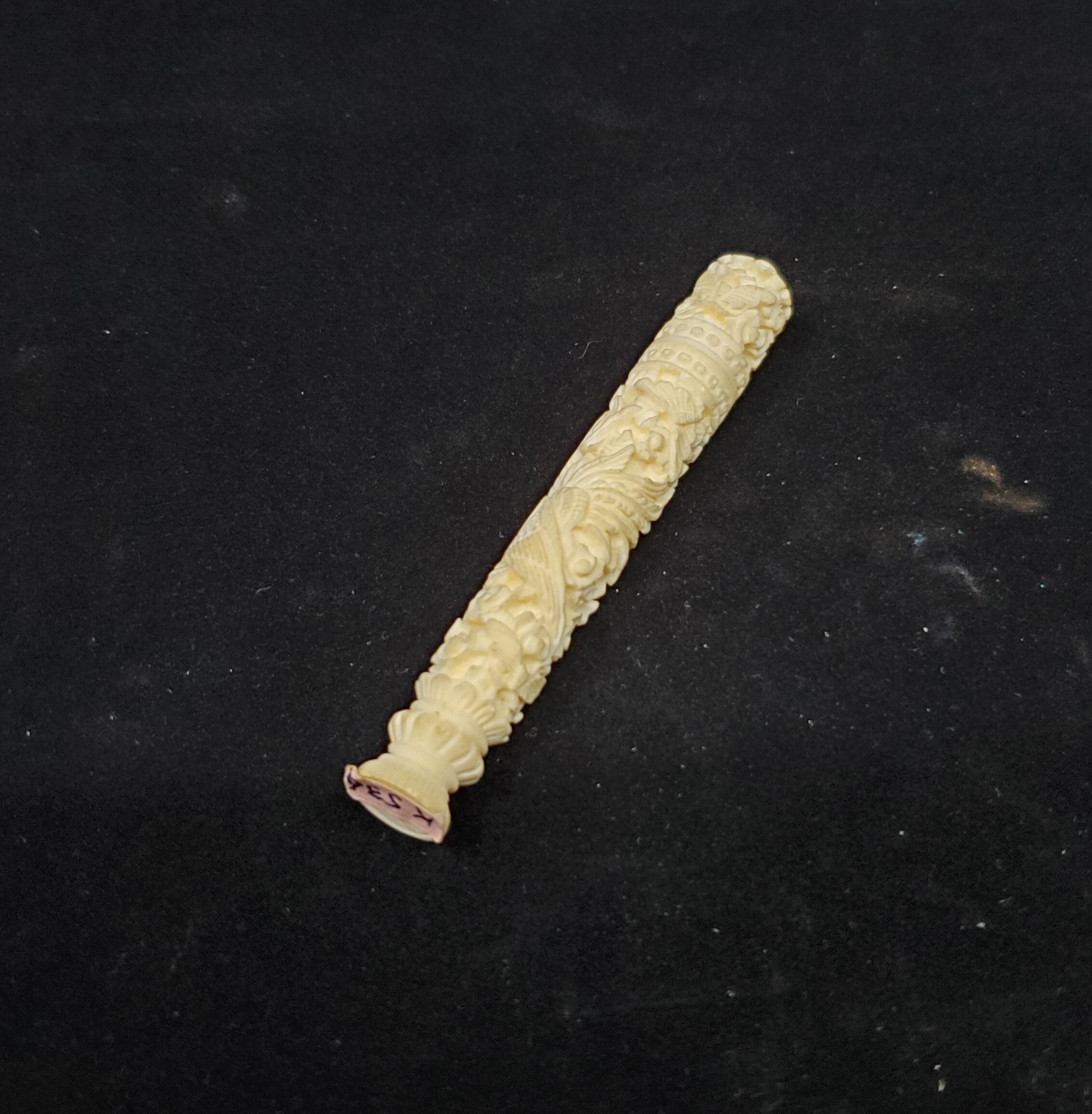 Carved ivpry cream coloured needle case. Carved flowers, brds, butterflied all over case. 2 rows of small circles above and below the opening.