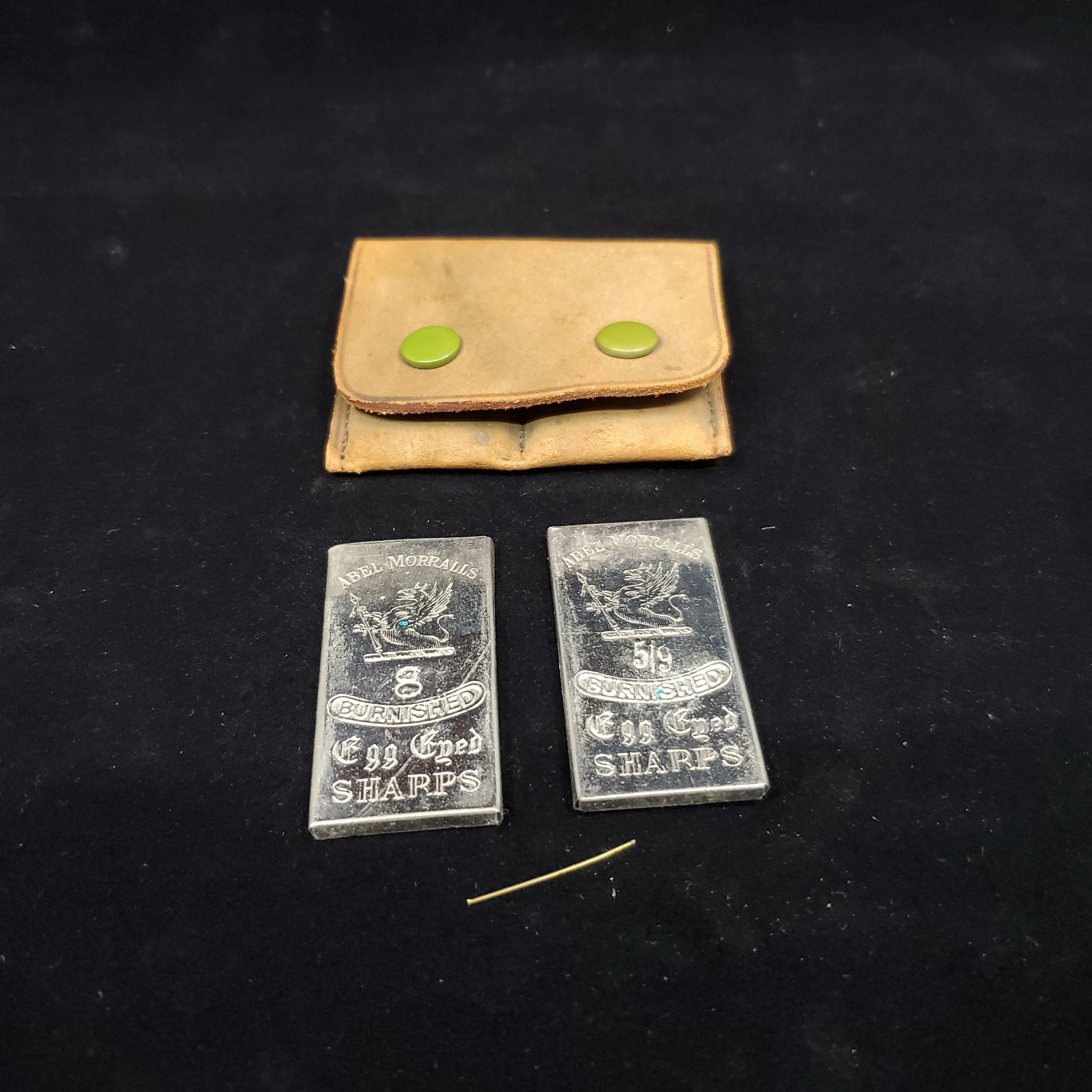 Leather needle case with 2 brass dome fasteners. Mid brown leather case seems to have been dyed green which is now disappearing. Domes green. Inside divided into 2 sections, each containing j metal cased needles. Stamped ÒAbel Morralls Burnished Egg Shaped Sharps.On back - 1 broken - JohnsonÕs Patent Slide.