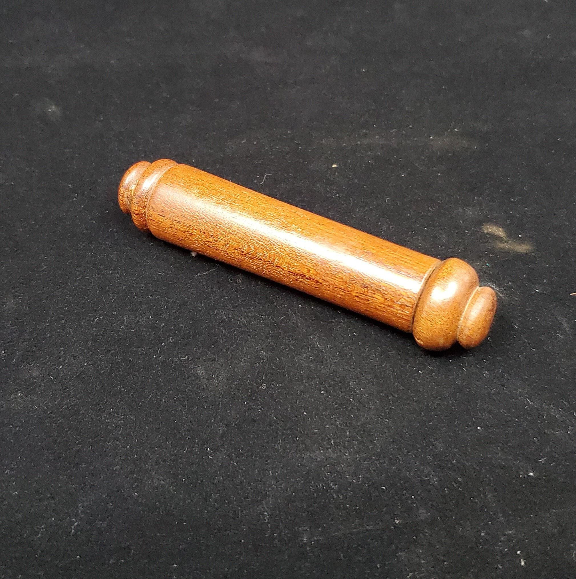 Hand crafted wooden needlecase. Reddish brown wood. Pull out top.