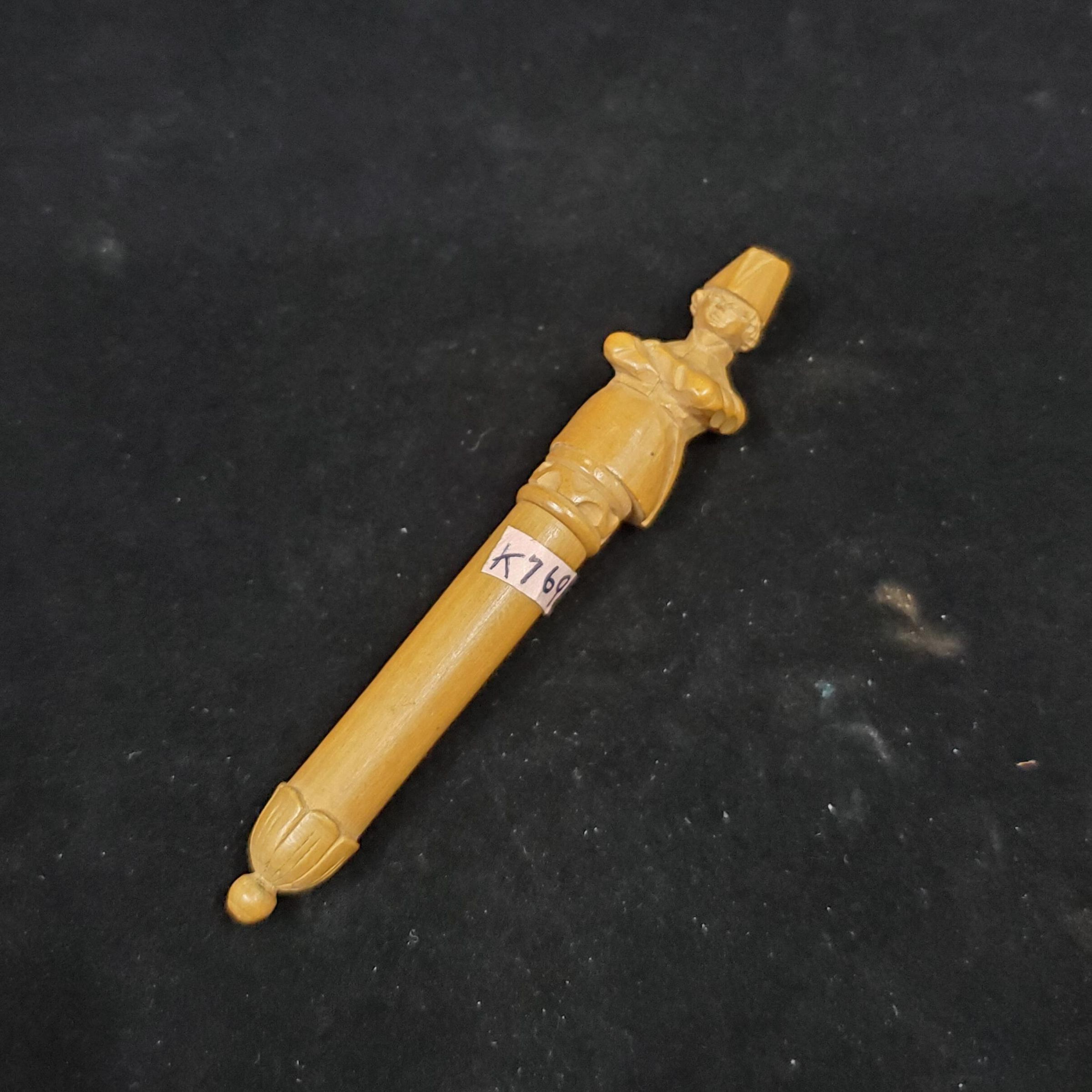 Wooden needlecase. Light tan coloured wood. Has simle leaf carving at one end. Bust of the Diuke of Wellington at top end (1769-1852) . Pull off end. No marks.