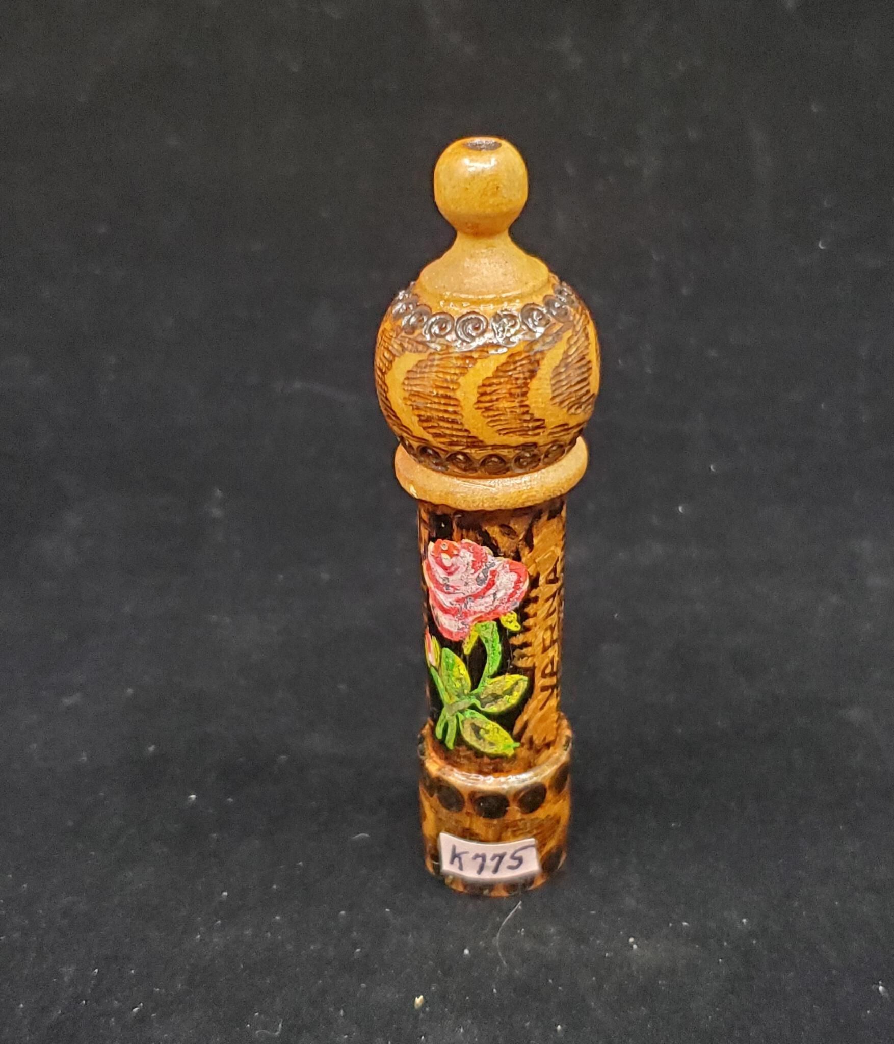 Wooden Souvenir needle case. Light and dark brown wood. Painted rose and leaves on side. Onion dome screw top. On side reads Varna Other side is not clear - could be Bulgaria?
