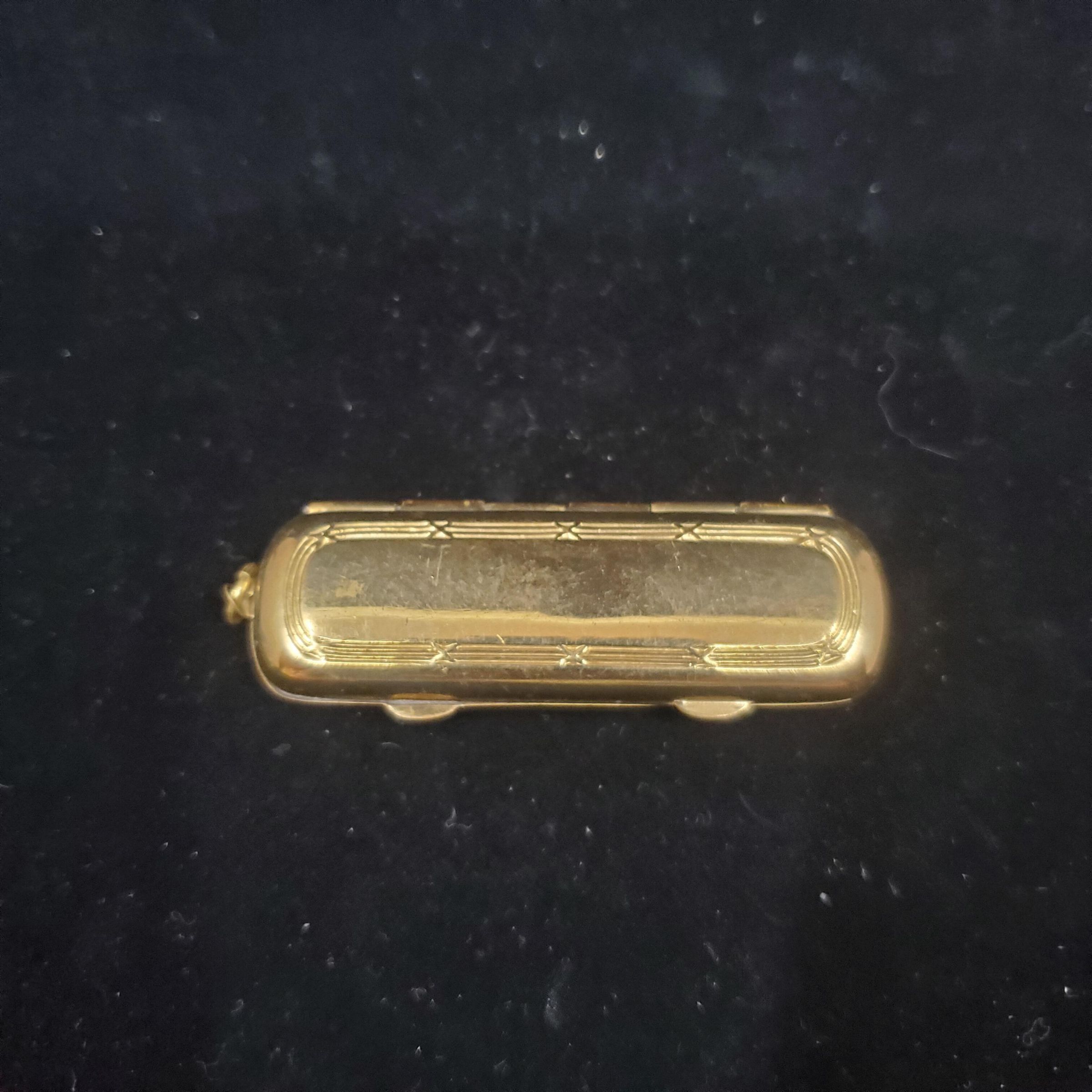 Flat brass needle orr court plaster case. Has loop at top for hanging. Line design around outside edge. Inside lined with green velvet One side has bar across.