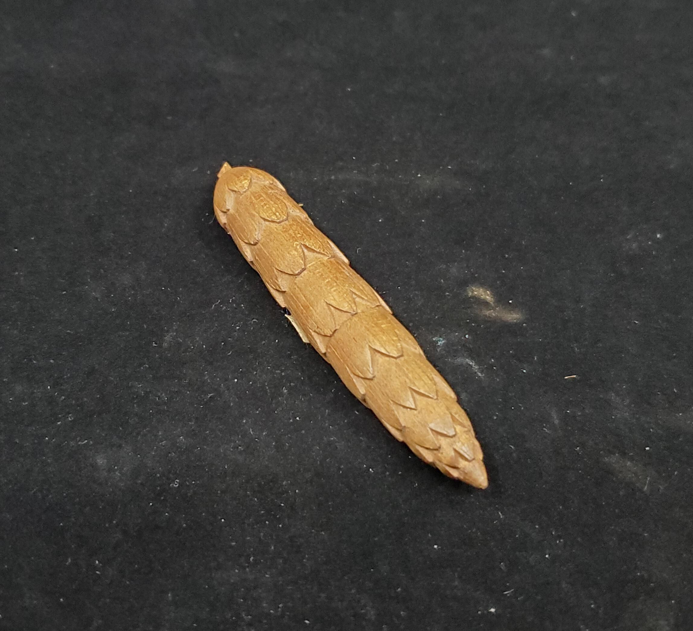 Hand carved needle case in the shape of a cone. Stem end. Darker brown colour than shows in the picture. Unpolished raw wood.