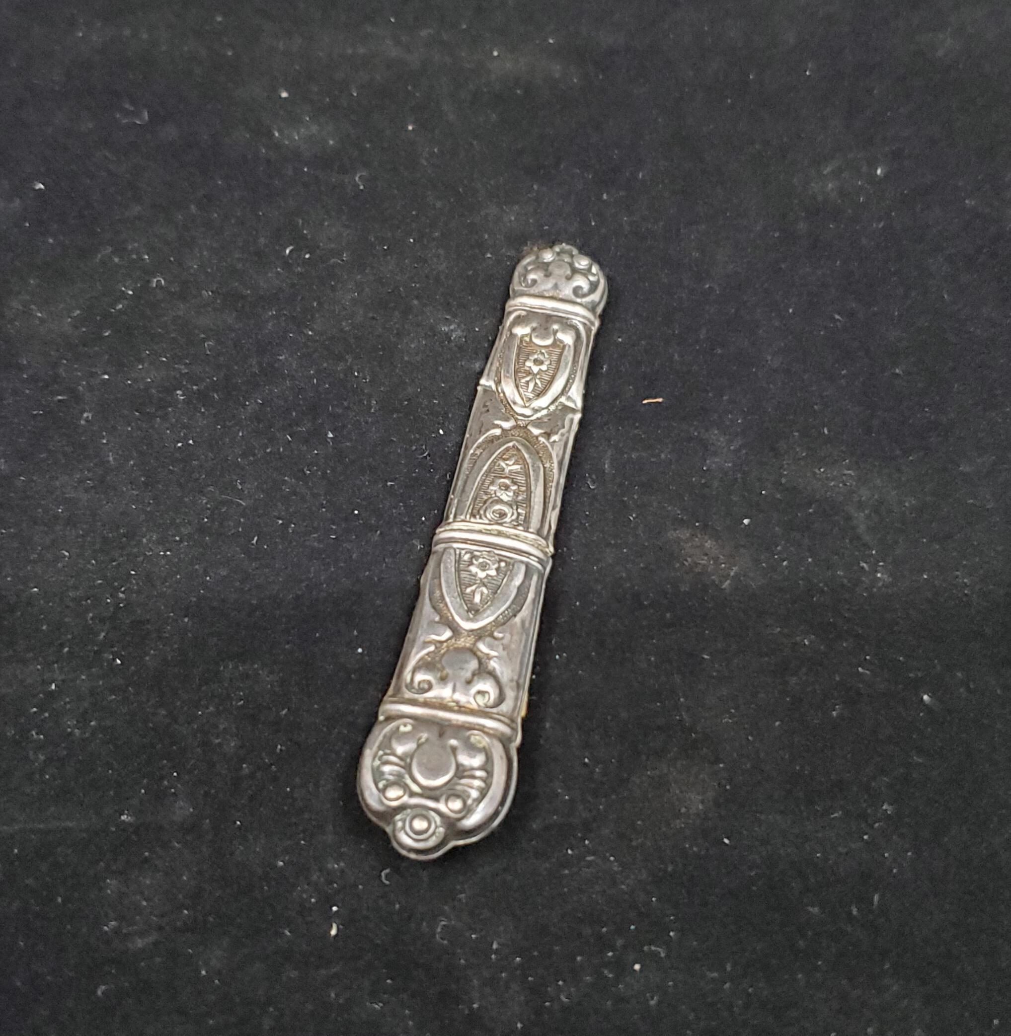 Silver needle case with all over design of flowers, roses, fleur de lys, daisy. No marks.