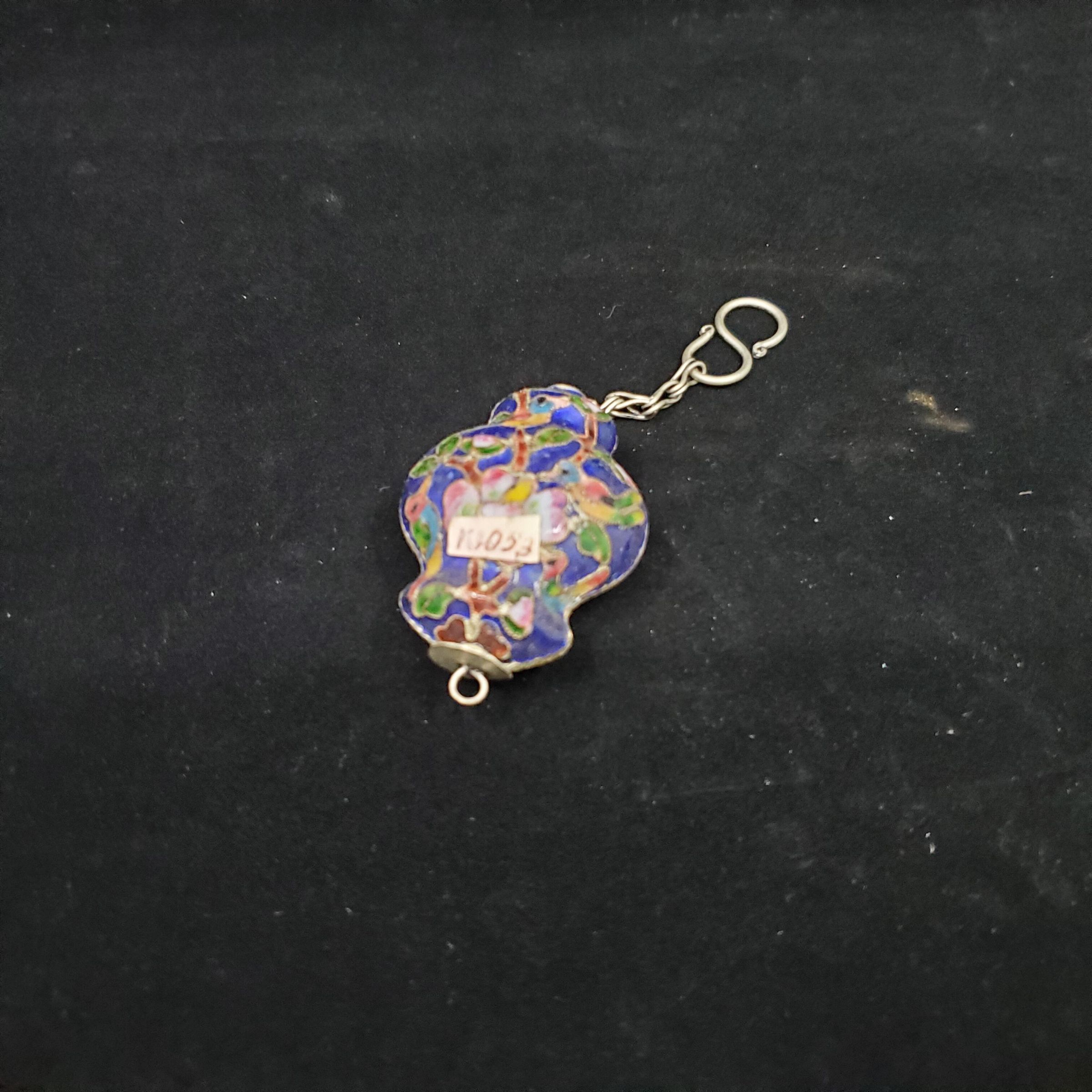Cloisonne Needle Case in form of vase. Modern colourful cloisonne of birds, flowers and chainlike dividers of the cloisons. Metal tube holder for needles in center with chain and clip at top. Pull ring at bottom.