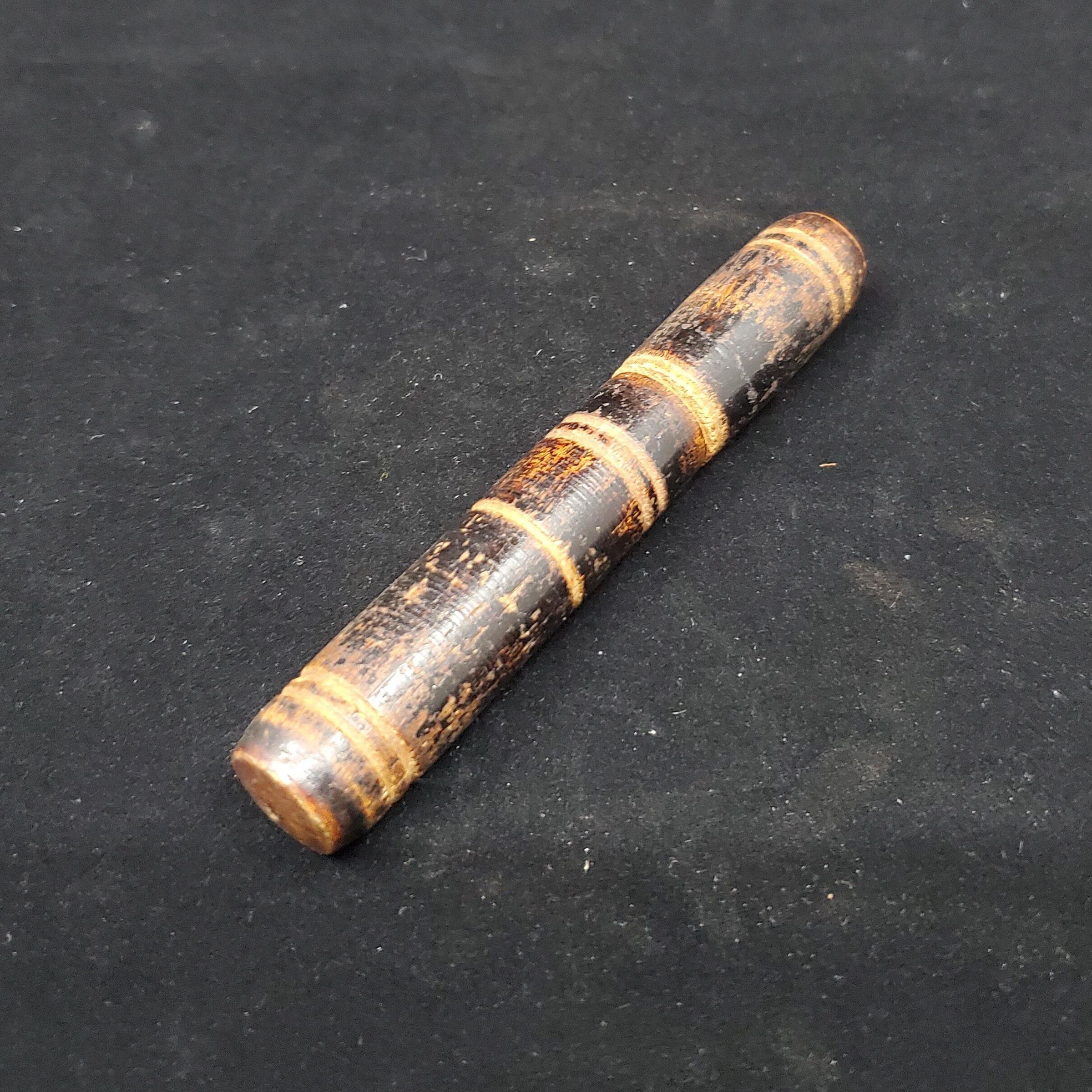 Wooden needle case. Appears to be hand made. Design of narrow bands at intervals. Dark brown painted wood.