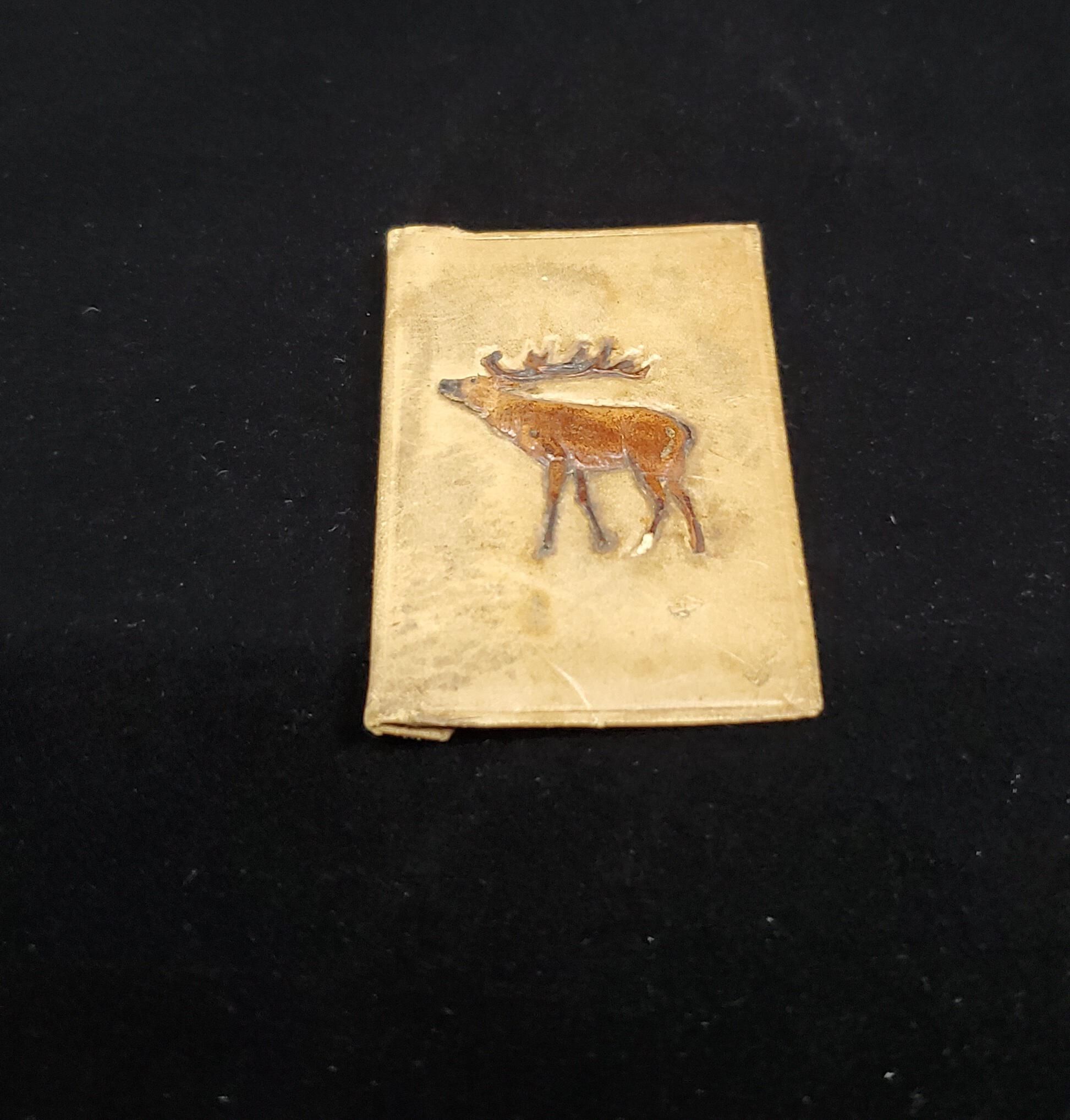 Small envelope type case made of leather (kid?). Light tan in colur, smooth suede feel, with dark brown moose complete with antlers on outiside. . Back closure. Inside lined with striped beige silky material. To hold packet of needles.