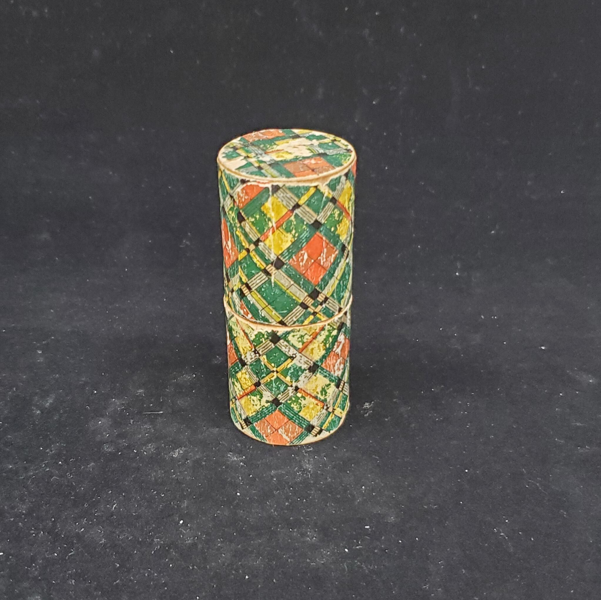 Plaid Mauchline Needle Case. Tube shape. Under part wooden, covered with plaid paper. Plaid mainy red, green, black and yellow in poor condition.