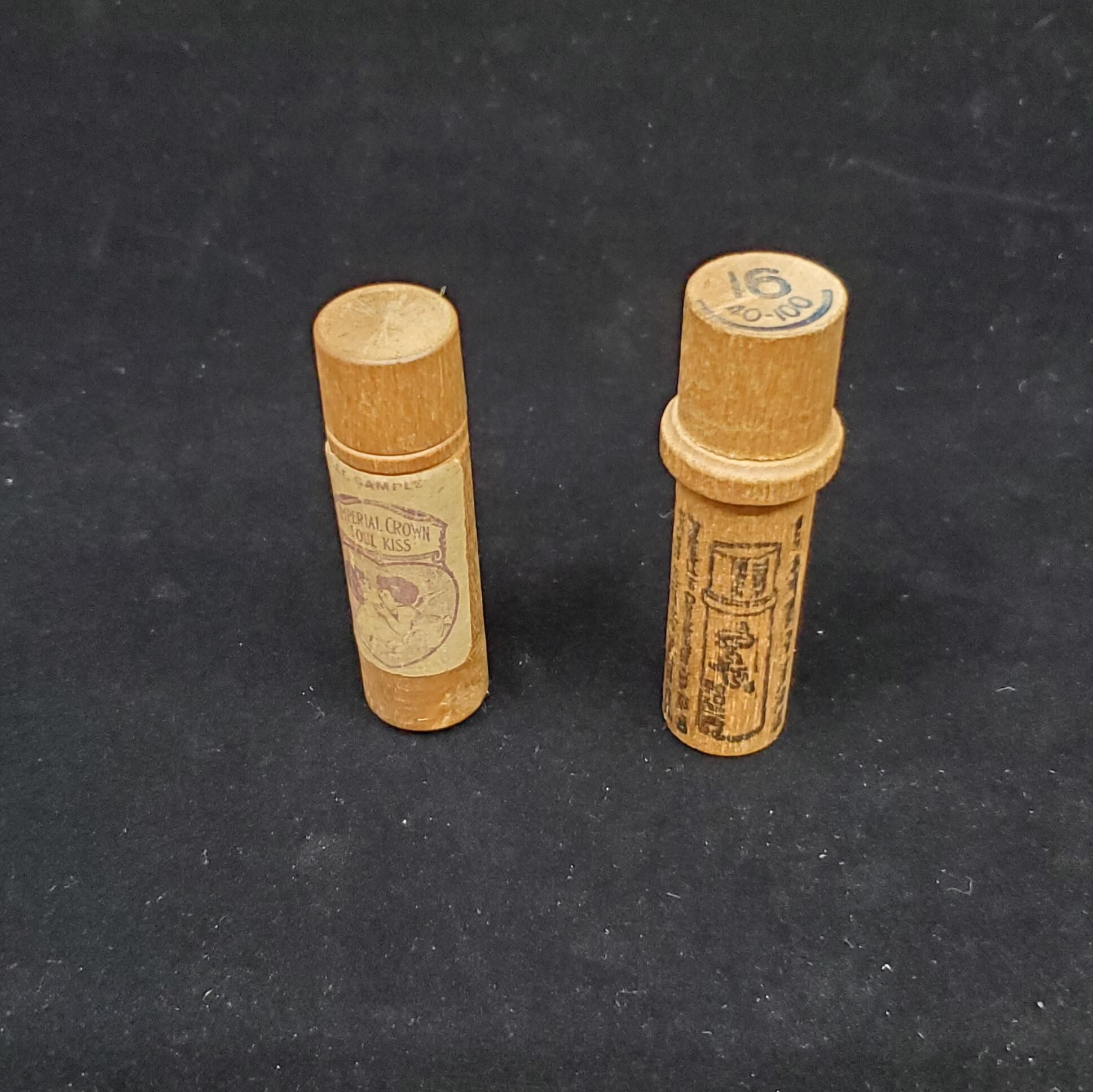 2 wooden sewing machine needle cases. 1) Boye Brand - The Boye Needle Co. Chicago, Ill.2) Imperial Crown Soul Kiss - shows a picture of Mother and Baby kissing. Also says Free Sample.