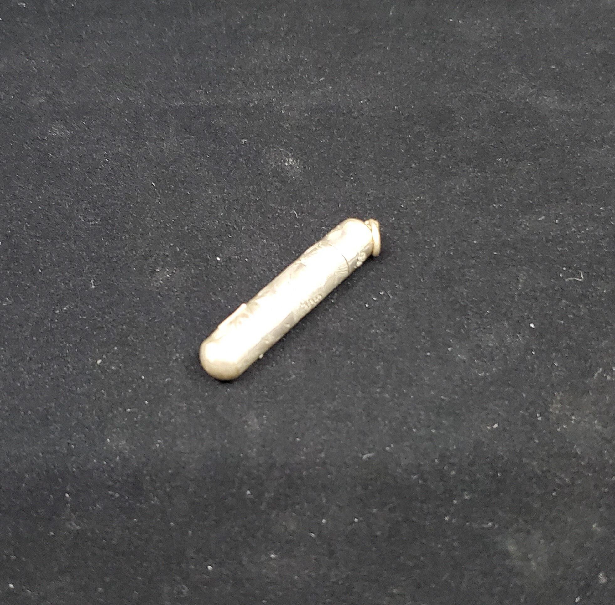 Small silver needlecase. All over pattern of leaves and flowers. Hanging loop - for chatelaine?