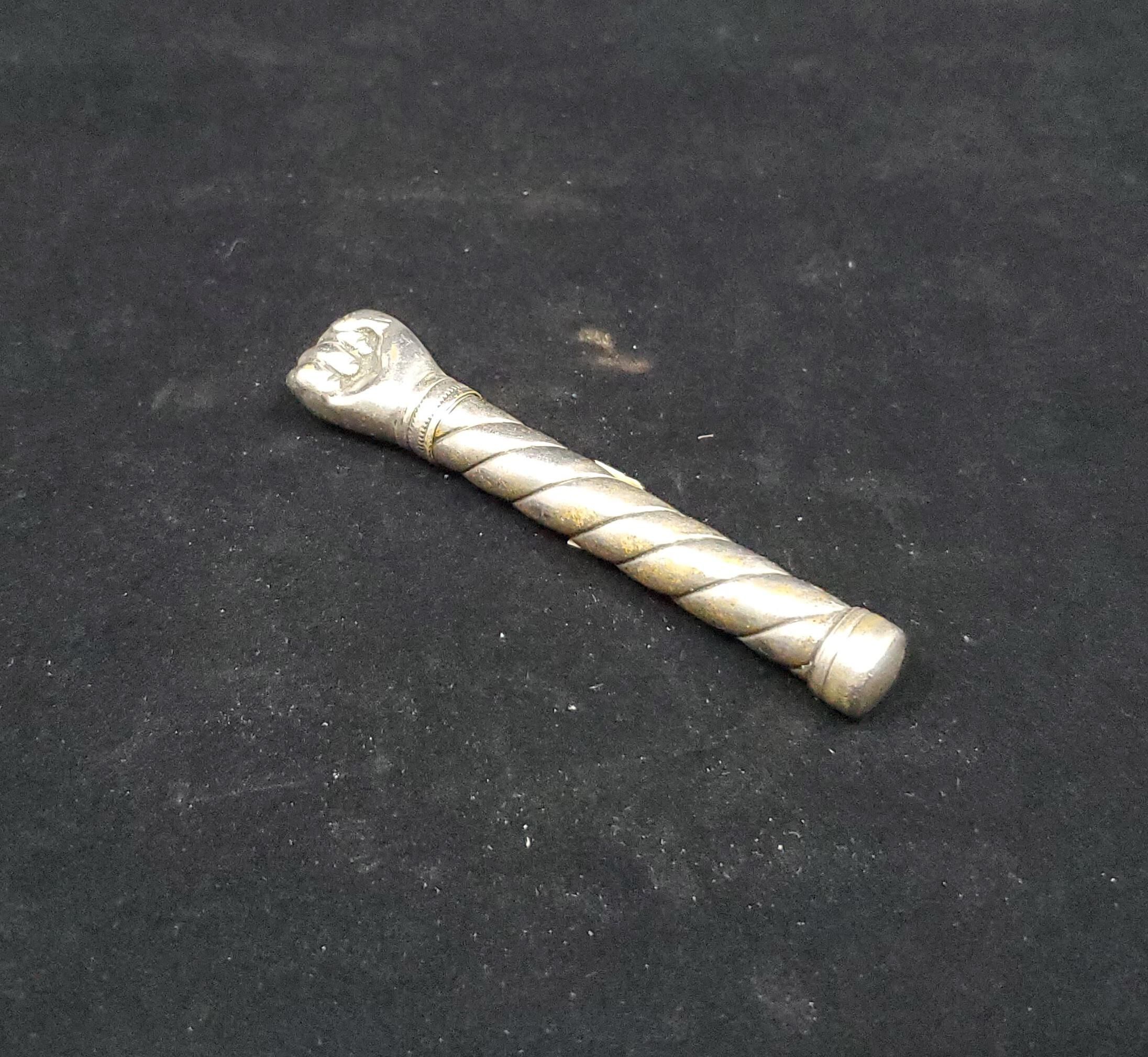 Silver needle case with clenched fist at one end. Spiral. lines along length of case. Screw opening. No marks