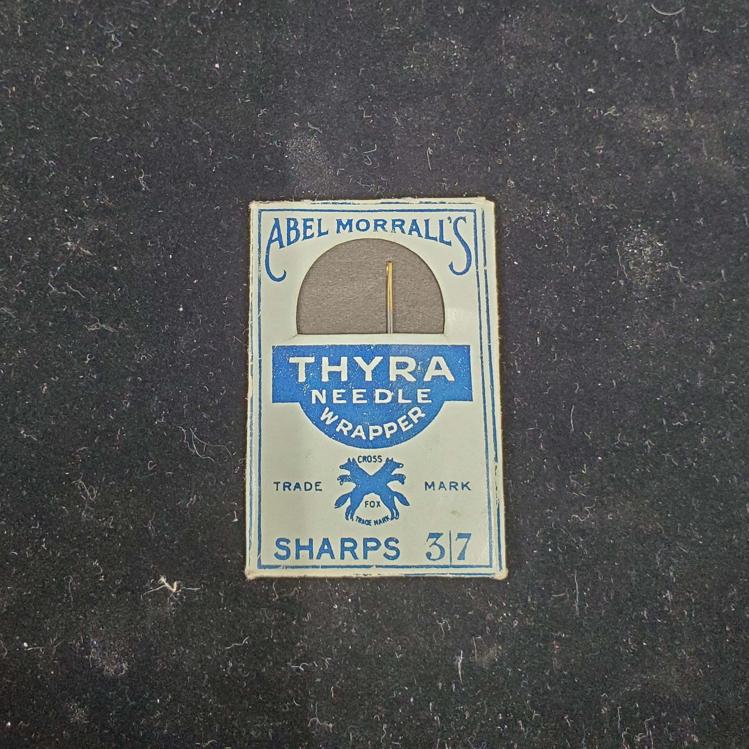 Needle packet. 2 shades of blue. Advertising. Cover reads ÒAbel MorrellÕs Thyra Needle Wrapper Sharps 3/7Ó and trade Mark.Back has more advertising. Inside only 1 needle left.