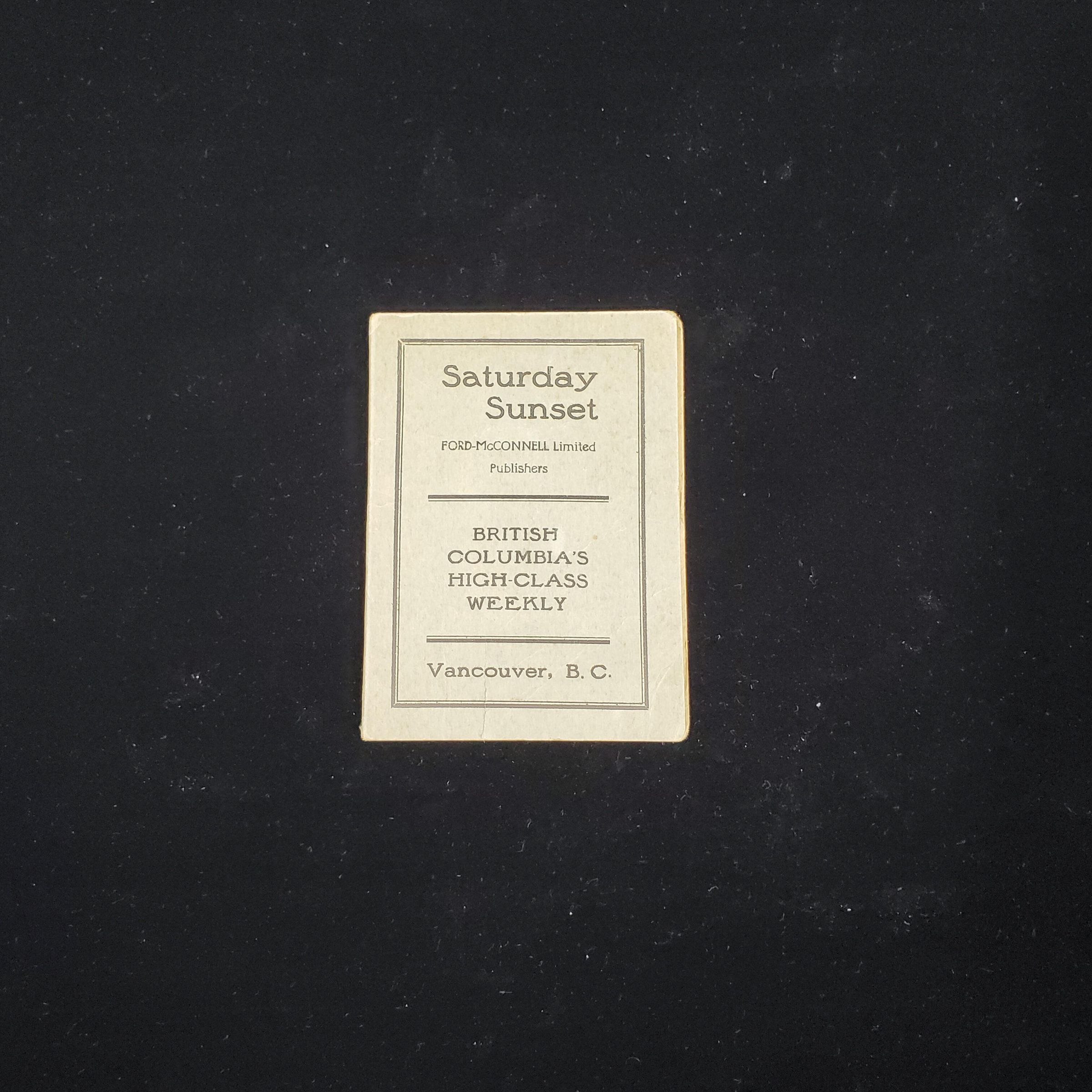 Advertising needle packet. Gray-green with black print. On front cover ÒSaturday Sunset -Ford-McConnell publishers British ColumbiaÕs High Class Weekly Vancouver, B.C.Ó Back cover same. Inside 1small packet needles and cloth with larger needles.More advertising inside.
