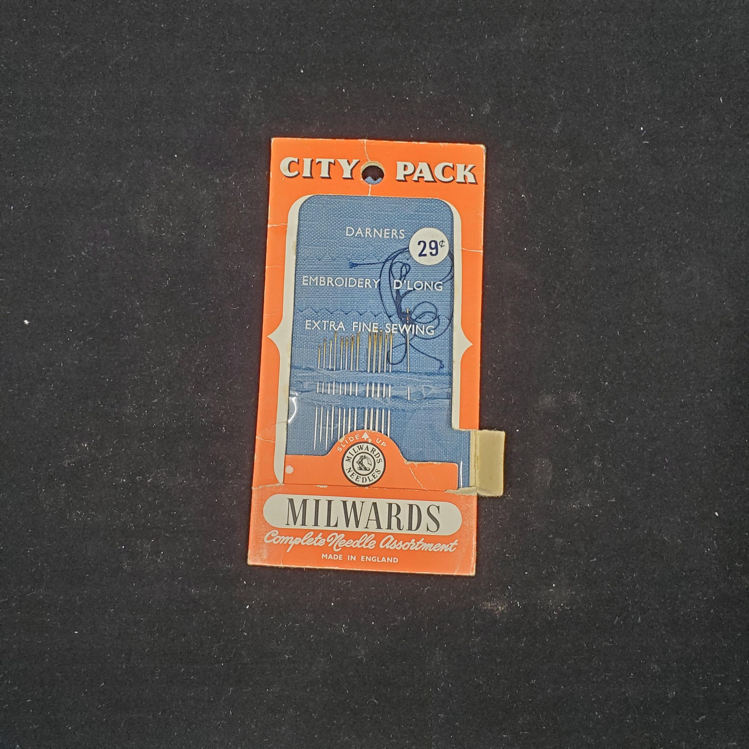 Needle Pack- slide-up type package. Colours - red, white and black. Front has name 'City Pack' with Milwards Needles and logo below clear plastic which gives view of needles inside. On cover also Milwards Complete Needle Assortment Made in England. Inside blue-gray cloth with needles. Back - description plus Made in England from Sheffield Steel.