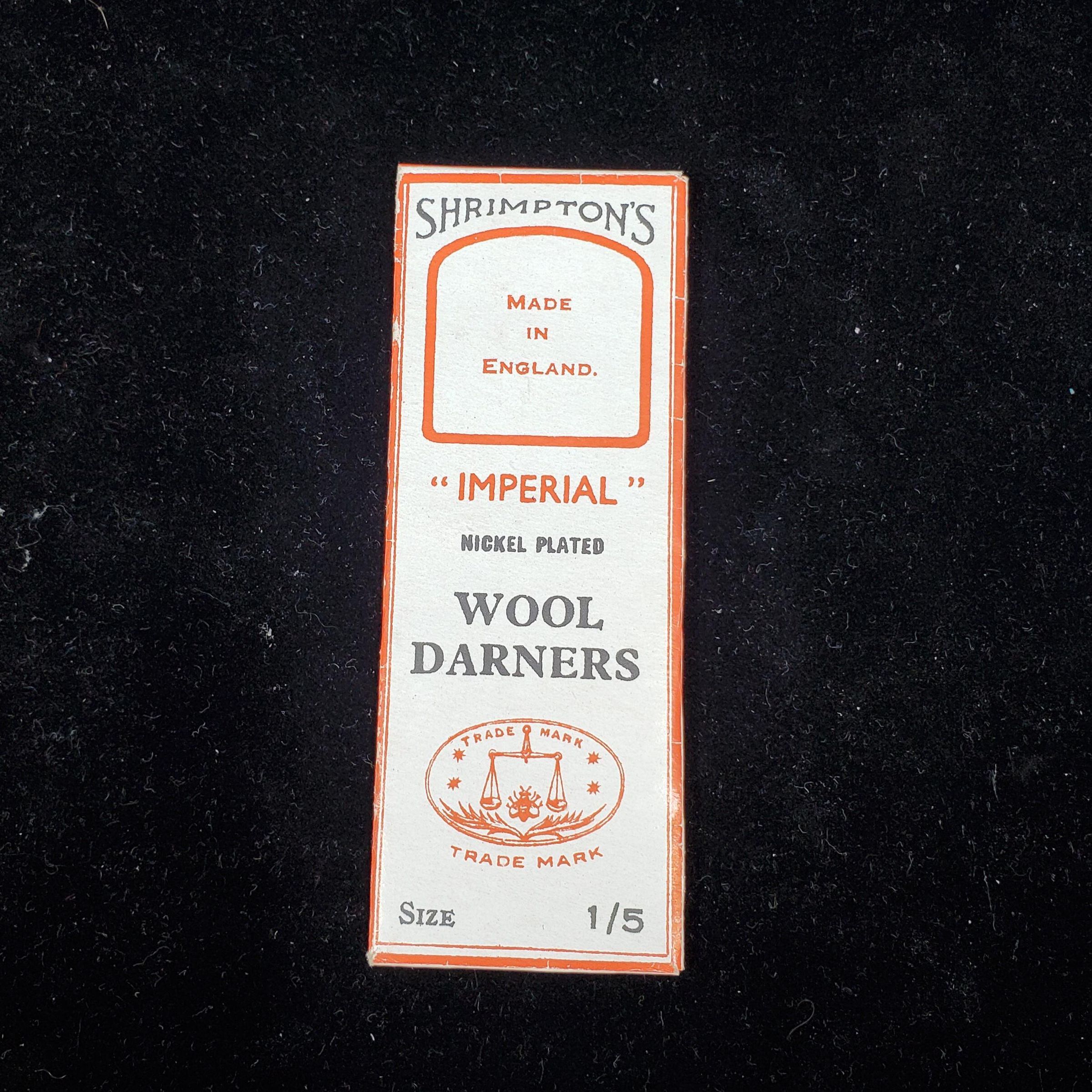 Needle Packet, white with red and black. ÒShrimptonÕs Made in England Imperial Nickel Plated Wool Darners Size 1/5Ó with trademark on front cover. More advertising on back. Inside darning needles.